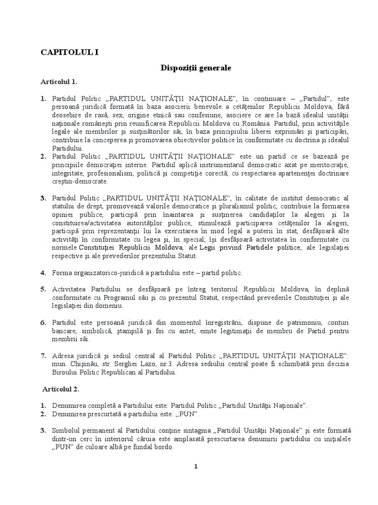 1. Partidul Politic „PARTIDUL UNITĂŢII NAŢIONALE”, este un Partid politic, care militează