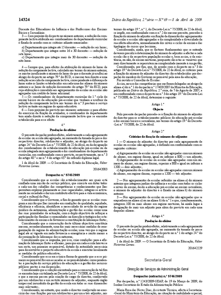 termos do artigo 19.º, n.º 1, do Decreto-Lei n.º 75/2008, de 22 de Abril, se impõe, em conformidade com o n.º 2 do mesmo preceito, proceder à fixação do número de adjuntos em função da dimensão dos agrupamentos de escolas e escolas não agrupadas e da complexidade e diversidade da sua oferta educativa, nomeadamente dos níveis e ciclos de ensino e das tipologias de cursos que lecciona; Considerando, ainda, que os factores fundamentais que se entende deverem presidir à determinação do número de adjuntos a afectar a cada escola são o da respectiva população escolar e, bem assim, o da exis- tência, ou não, de ensino nocturno, porquanto são estas as variáveis que mais directamente se repercutem na complexidade inerente à sua gestão; Considerando, por fim, que, de acordo com o disposto no n.º 3 do artigo 19.º do Decreto-Lei n.º 75/2008, de 22 de Abril, os critérios para