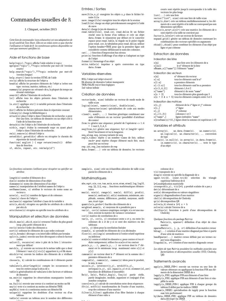 J. Chiquet, octobre 2015 data(x) charge le jeu de données x matrix(x,nrow=,ncol=) crée une matrice; les éléments de x