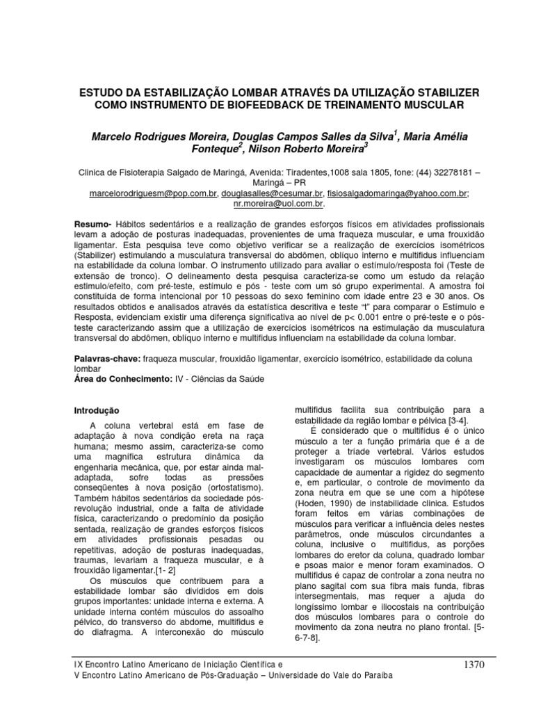 Palavras-chave: fraqueza muscular, frouxidão ligamentar, exercício isométrico, estabilidade da coluna