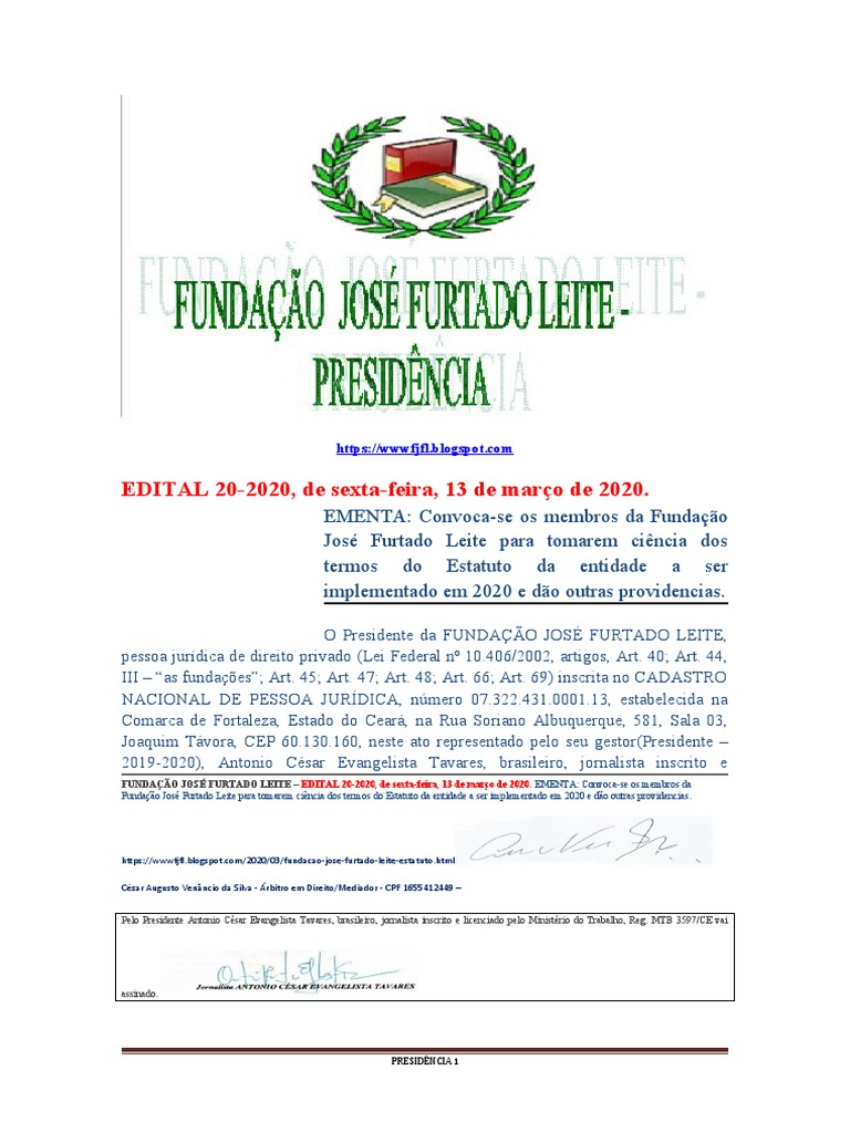 FUNDAÇÃO JOSÉ FURTADO LEITE – EDITAL 20-2020, de sexta-feira, 13 de março de 2020. EMENTA: Convoca-se os membros da