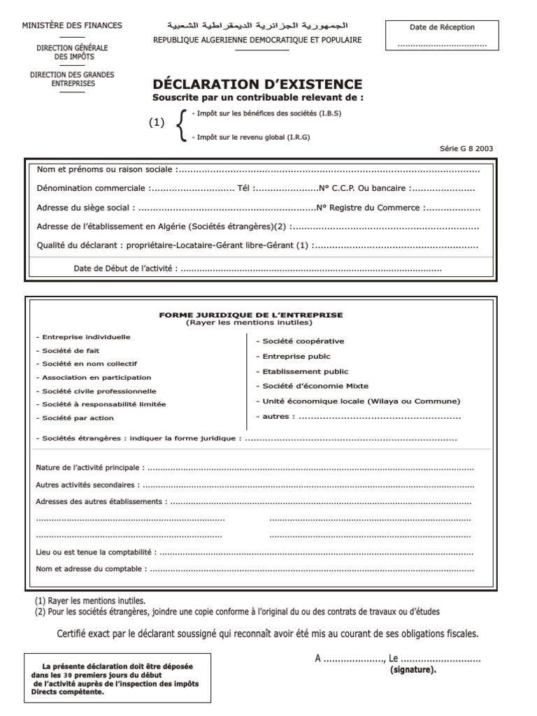 MINISTÈRE DES FINANCES اﻟﺠﻤﻬﻮﺭﻳﺔ اﻟﺠﺰاﺋﺮﻳﺔ اﻟﺪﻳﻤﻘﺮاﻃﻴﺔ اﻟﺸﻌﺒﻴﺔ Date de Réception
