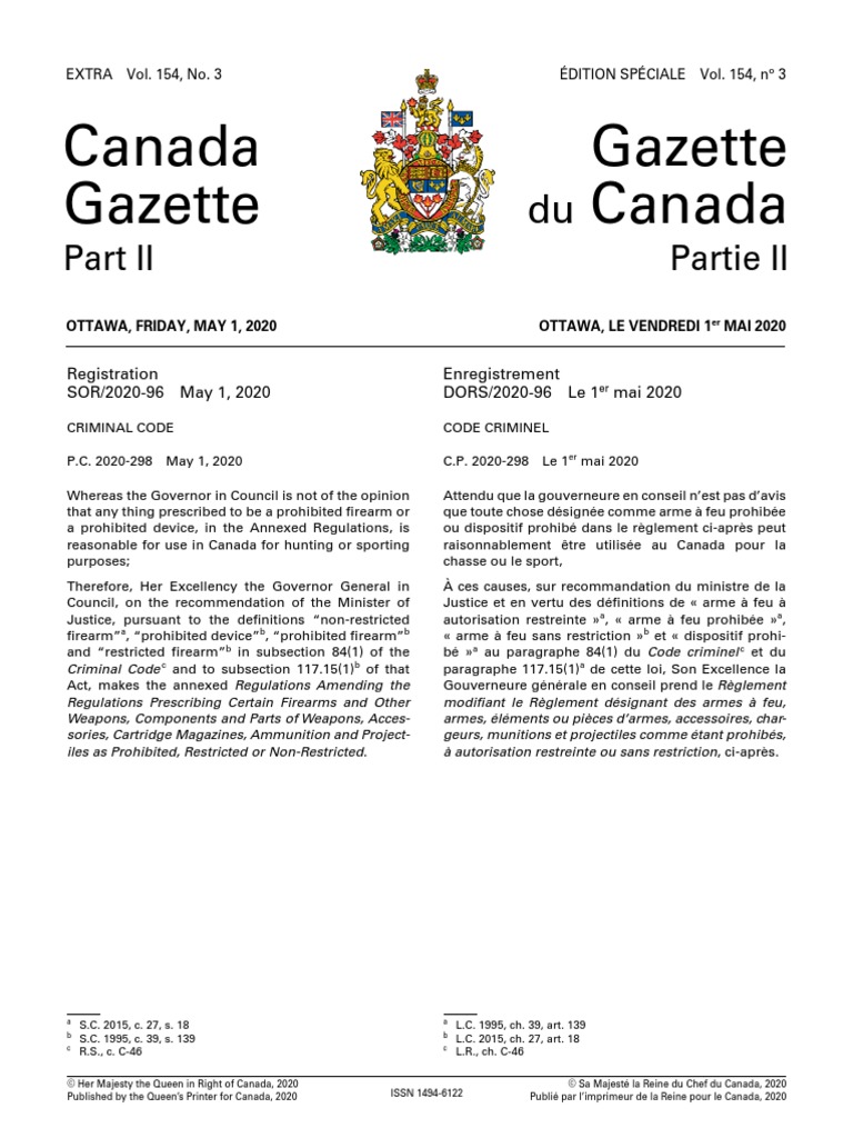CRIMINAL CODEP.C. 2020-298 May 1, 2020Whereas the Governor in Council is not of the opinion that any thing prescribed to be a prohibited firearm or a prohibited device, in the Annexed Regulations, is reasonable for use in Canada for hunting or sporting purposes;Therefore, Her Excellency the Governor General in Council, on the recommendation of the Minister of Justice, pursuant to the definitions “non-restricted firearm”
