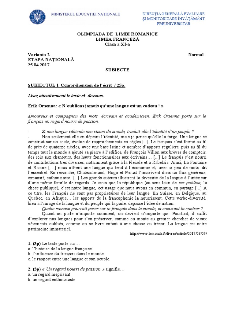 SUBIECTUL I. Compréhension de l’écrit / 25p.