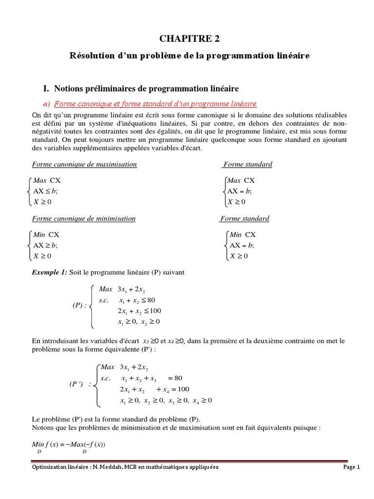 Optimisation linéaire : N. Meddah, MCB en mathématiques appliquées Page 16