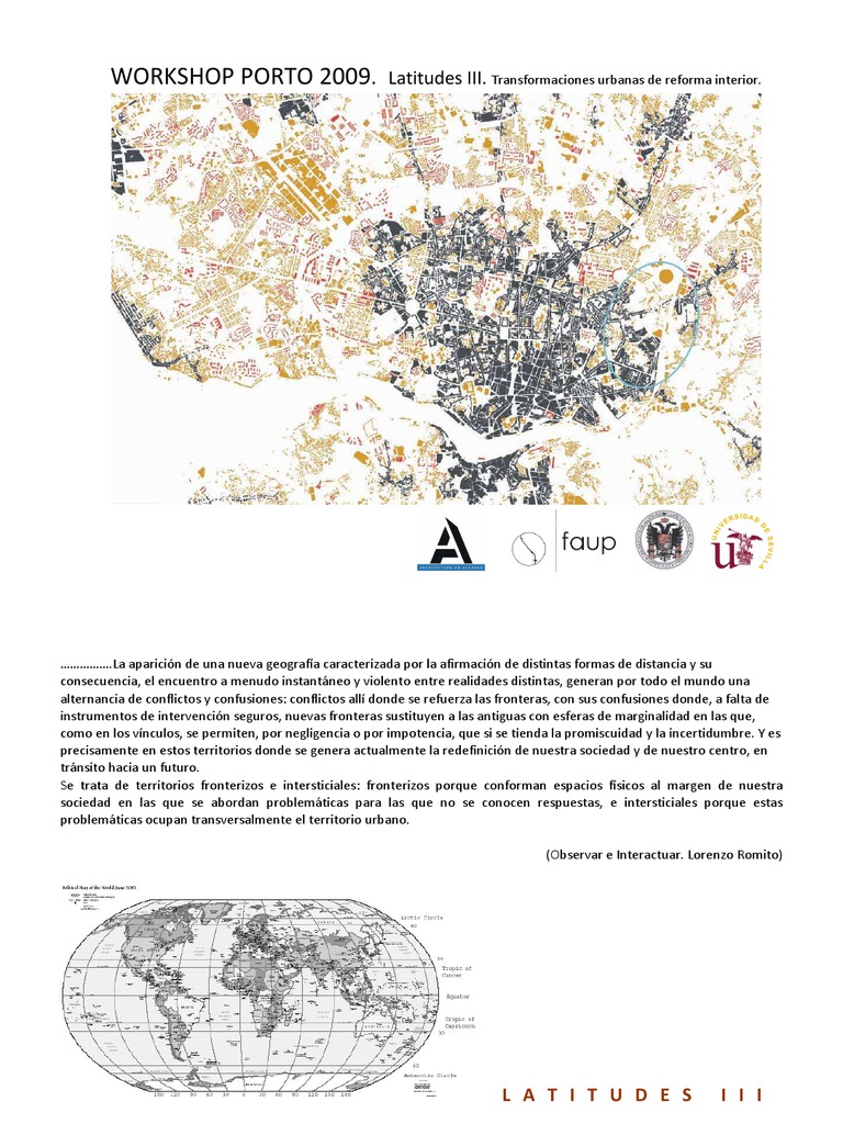 será el ámbito de referencia que nos servirá como laboratorio para el presente curso. entre la forma y los acontecimientos que la promueven. por no pertenecer a ninguna figura o acción reconocible. aparece ahora en toda su dimensión como lugar de posibilidad en toda su riqueza ambigua e indeterminada. salvando incompatibilidades: topografías. expansiva. cuando éstas han desaparecido.acciones de progreso etc. De manera elemental. El sistema muchas veces desdibujado. física y conceptualmente. Las construcciones-arquitecturas que físicamente la hacen realidad.) dibuja normalmente una línea-espacio-huella que en la mayoría de los casos es la marca física de la muralla medieval o sus trazas. que el cambio brusco entre el desarrollo de la ciudad medieval y la moderna (industrial. Después de estas primeras marcas históricas el crecimiento de las ciudades podrán a prueba los modelos de ciudad planificados a la luz de los CIAM y su crisis posterior. Esta línea de trabajo obliga a . industrial-residencial. colonial. Todos estos condicionantes. caldo de cultivo para operaciones tendentes de articular sistemas y situaciones de hondo calado infraestructural. interactuando en el seno de un medio sistémico. emergen como formas y figuras reconocibles en el texto gráfico de la ciudad. Por ello se ha escogido para este curso de Latitudes II. El tejido urbano es un “subsistema” paradigmático donde podremos reconocer muy bien su lógica de “relación”. política y económica. social. La ciudad de Oporto. La ciudad evolucionará de manera orgánica creciendo a través de áreas de oportunidad. En todas estas ciudades se reconocerá su núcleo primitivo y el desarrollo del mismo. En este curso se trabajará en la investigación de estos sistemas de articulación y en la formulación de arquitecturas figuras o formas a partir de la modificación de algún o algunas relaciones del sistema al que pertenece. patrimonio histórico . se ven sometidas igualmente a las mismas relaciones del subsistema al que pertenecen. infraestructuras-espacios libres. medios urbanos tan lejanos en latitud y variables de formación. su organización y sus tiempos. etc. podríamos afirmar. como lógicos en su organización sistémica.L A T I T U D E S I I I S I S T E M A S TR ANFORM ACION ES URB AN AS DE CR ECIMIEN TO INTER IOR OPORTO 22FEB01 La arquitectura de los sistemas pretende reconocer y trabajar desde la lógica y la coherencia existente.