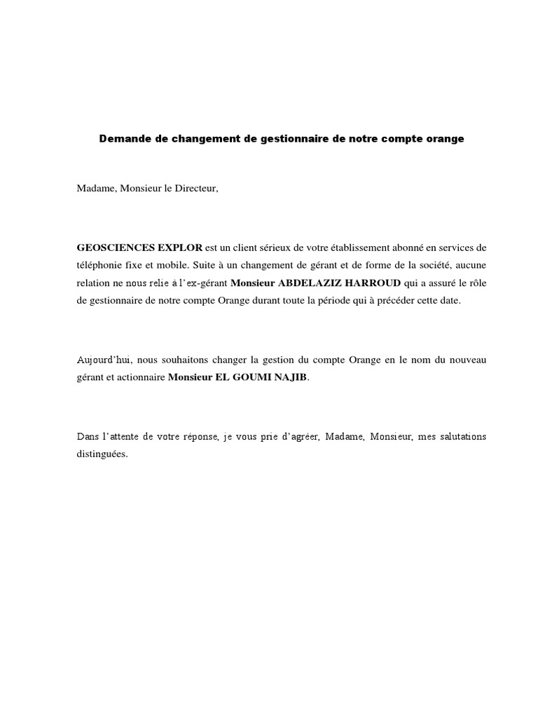Demande de changement de gestionnaire de notre compte orange