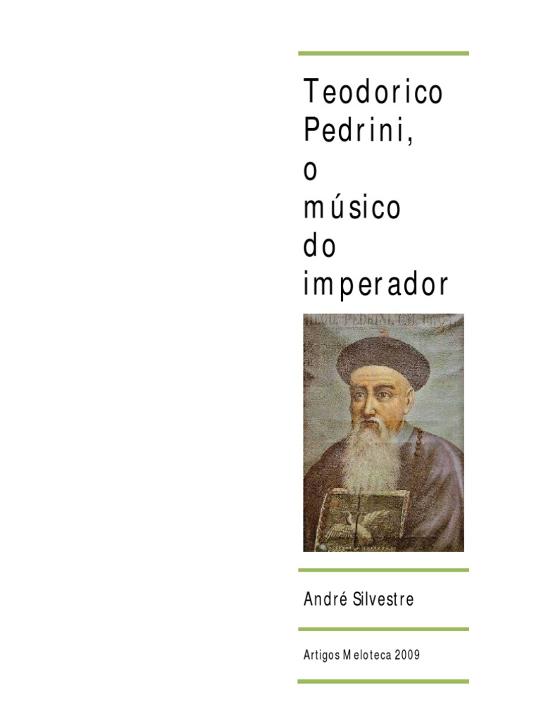 um manuscrito duma cantata que indica como seu autor o P. NOTA FINAL O P.02. através do anagrama "nepridi". o músico do imperador André Silvestre Morreu a 10. Pedrini. com 77 anos. fundada em 1924 em Pequim. Manteve-se fiel à Santa Sé até ao fim. deu-me a seguinte informação: os padres do Verbo Divino descobriram nos Arquivos da Universidade de Fugen. Pedrini foram celebradas a expensas do Imperador a 27. músico da corte. Dulucq.1746. Teodorico Pedrini. 8 Foi durante a sua vida beneficiado com favores mas também com provações. veterano da China. Esta cantata foi decifrada e executada em público. As cerimónias fúnebres do P. estes últimos não foram capazes de destruir a sua alegria natural e o seu optimismo.12. Foi um homem duma coragem e duma constância extraordinárias. Meloteca 2009 .1747. Todavia. Interpretaram-no facilmente como sendo o nome de Pedrini.