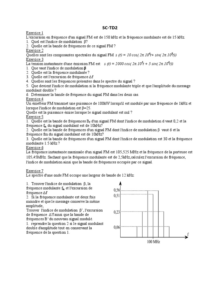 1. Quelle est la bande de fréquences Bf d'un signal FM dont l'indice de modulation d vaut 0,2 et la