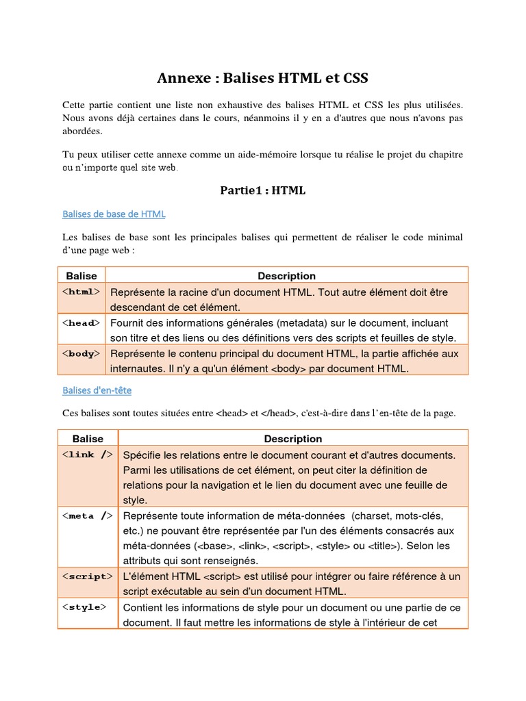 Cette partie contient une liste non exhaustive des balises HTML et CSS les plus utilisées.