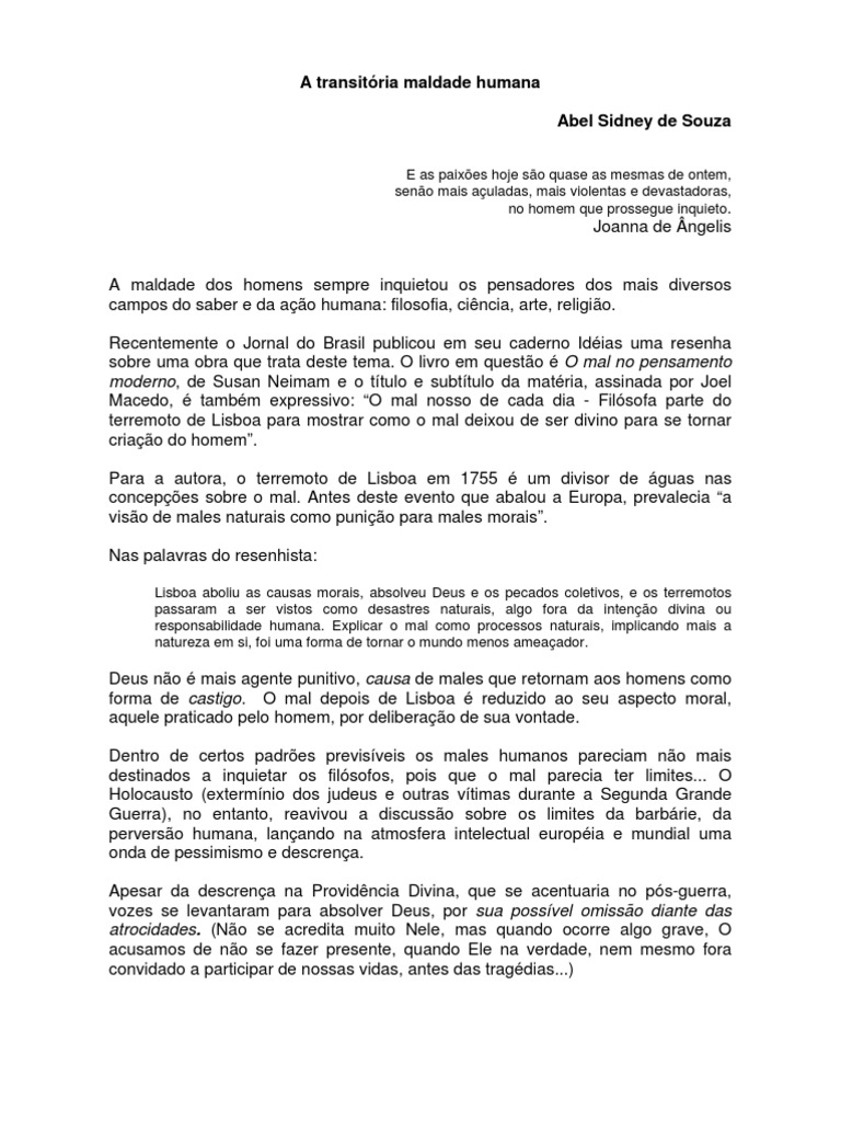 Recentemente o Jornal do Brasil publicou em seu caderno Idéias uma resenha sobre uma obra que trata deste tema. O livro em questão é O mal no pensamento moderno, de Susan Neimam e o título e subtítulo da matéria, assinada por Joel Macedo, é também expressivo: “O mal nosso de cada dia - Filósofa parte do terremoto de Lisboa para mostrar como o mal deixou de ser divino para se tornar criação do homem”.
