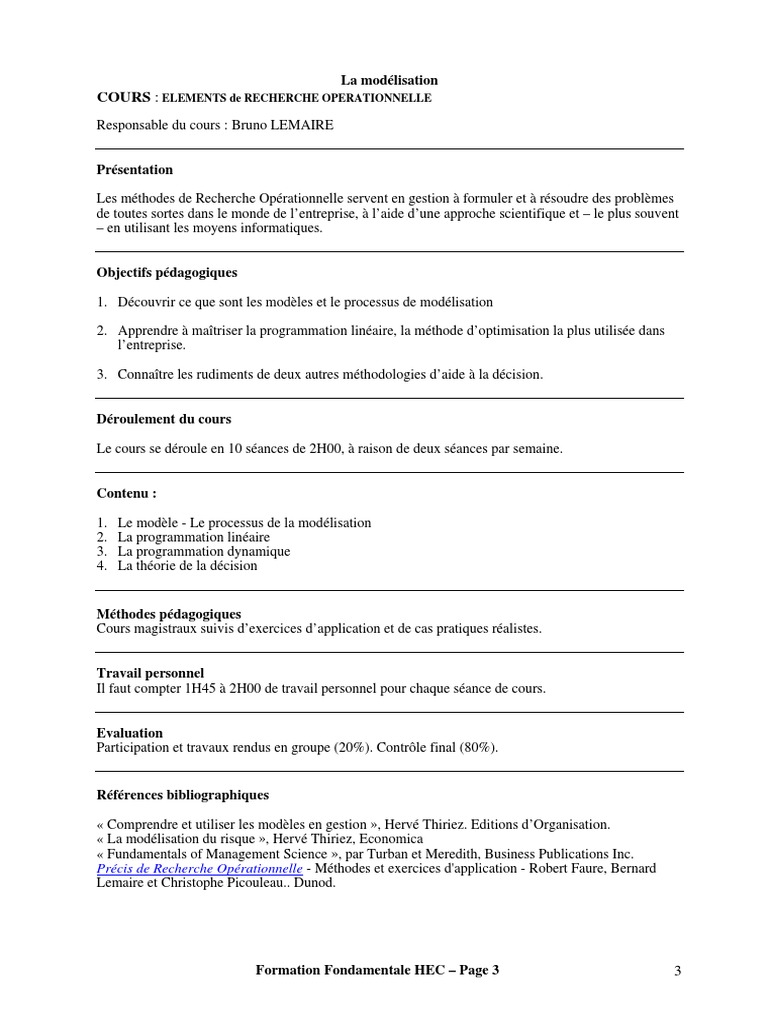 Plan du cours ‘Eléments de RECHERCHE OPERATIONNELLE’
