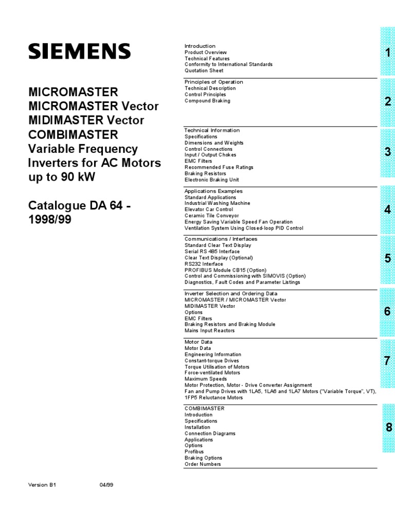 8/28 MICROMASTER (Vector) 1/2. 8/2 MICROMASTER (Vector) 6/7 T MIDIMASTER Vector 6/16 Technical data COMBIMASTER 8/2. 8/24 . 8/24 MICROMASTER. 3/34 See COMBIMASTER Separately ventilated motors 7/1 Motor/inverter correlation 7/3-7/27 SIMATIC. Appendix MICROMASTER MICROMASTER Vector MIDIMASTER Vector Page Page L S Line-protection fuses 3/13. 3/1 MICROMASTER Integrated 8/36 MIDIMASTER Vector 1/2. 3/4 PROFIBUS modules CB15 MICRO-/MIDIMASTER Vector 5/4 CB155 COMBIMASTER 8/30 Protection.8/34 MIDIMASTER Vector 3/3. 8/24 MICROMASTER INTEGRATED 8/23. 8/2 Vector control 2/2 P V/f mode 2/4 Parameter listing 5/11 Voltage derating 3/11 PID control 2/6 Voltage limiting filters (dV/dt) 6/8.3/36 MICROMASTER (Vector) 3/2 COMBIMASTER 8/1. MIDIMASTER Vector 5/1. MICROMASTER (Vector) 6/1 6/8-6/21 MIDIMASTER Vector 6/3 Load torque – square-law and constant 7/3-7/27 COMBIMASTER 8/25. 8/27 Load-side components 6/8-6/21 MICROMASTER INTEGRATED 8/35 M Interference suppression filters 6/8-6/21 Maximum cable lengths dV/dt filters 6/8-6/21 without output reactors 3/7. 5/3 COMBIMASTER 8/23. types of 3/5 R Relay contact ratings 3/1 RS485 and RS232 interfaces MICROMASTER. 3/1 Ordering numbers COMBIMASTER 8/2 See Selection and ordering data Tee connectors 8/28 Output reactors 6/9-6/21 V Overload capability 3/1.3/36 Weights MIDIMASTER Vector 3/1. integration of 5/4. 8/26 COMBIMASTER 8/21 Supply harmonics and impedance 3/9 Options Supply voltages 3/1. 8/26 Selection and ordering data Line reactors 3/28-3/31.7/2 Line reactors 6/8-6/21 with output reactors 3/7 Braking resistors 3/32 Motor-inverter combination Braking units 3/33. 6/7 Motor protection 7/2 SIMOVIS 5/7 Motor-side filters 6/1-6/21 Sizing data Motors with “d” type protection 7/2 See Selection and ordering data O Square-law load torque 7/3-7/27 Operation and observation Standard control panel 5/1.6/21 Planning and design notes W MICROMASTER (Vector) 3/1. MIDIMASTER Vector 5/1 Supply fuses 3/13.