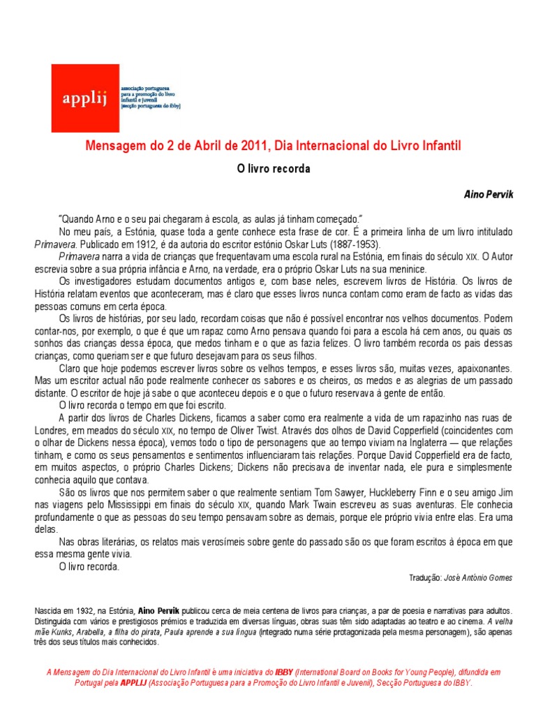 A Mensagem do Dia Internacional do Livro Infantil é uma iniciativa do IBBY (International Board on Books for Young People), difundida em Portugal pela APPLIJ (Associação Portuguesa para a Promoção do Livro Infantil e Juvenil), Secção Portuguesa do IBBY.