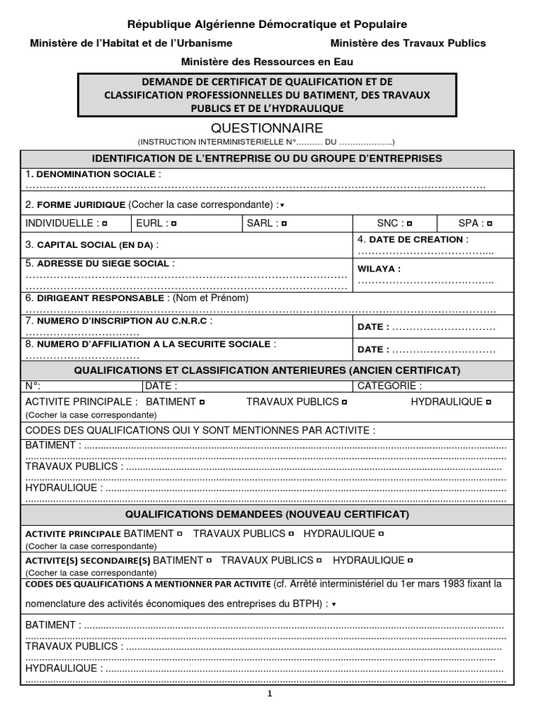 ACTIVITE PRINCIPALE : BATIMENT □ TRAVAUX PUBLICS □ HYDRAULIQUE □