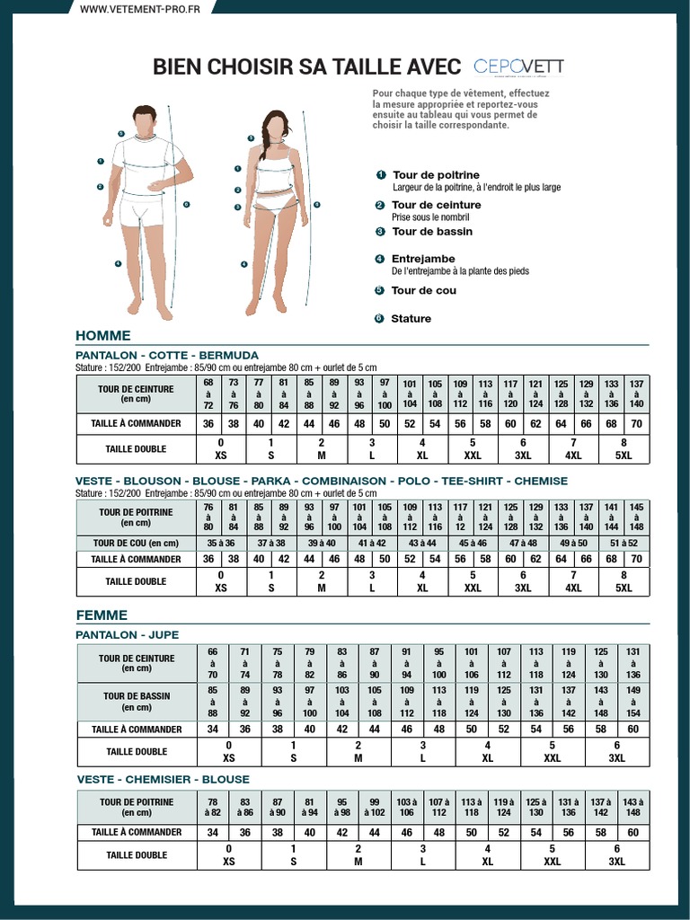 Stature : 152/200 Entrejambe : 85/90 cm ou entrejambe 80 cm + ourlet de 5 cm