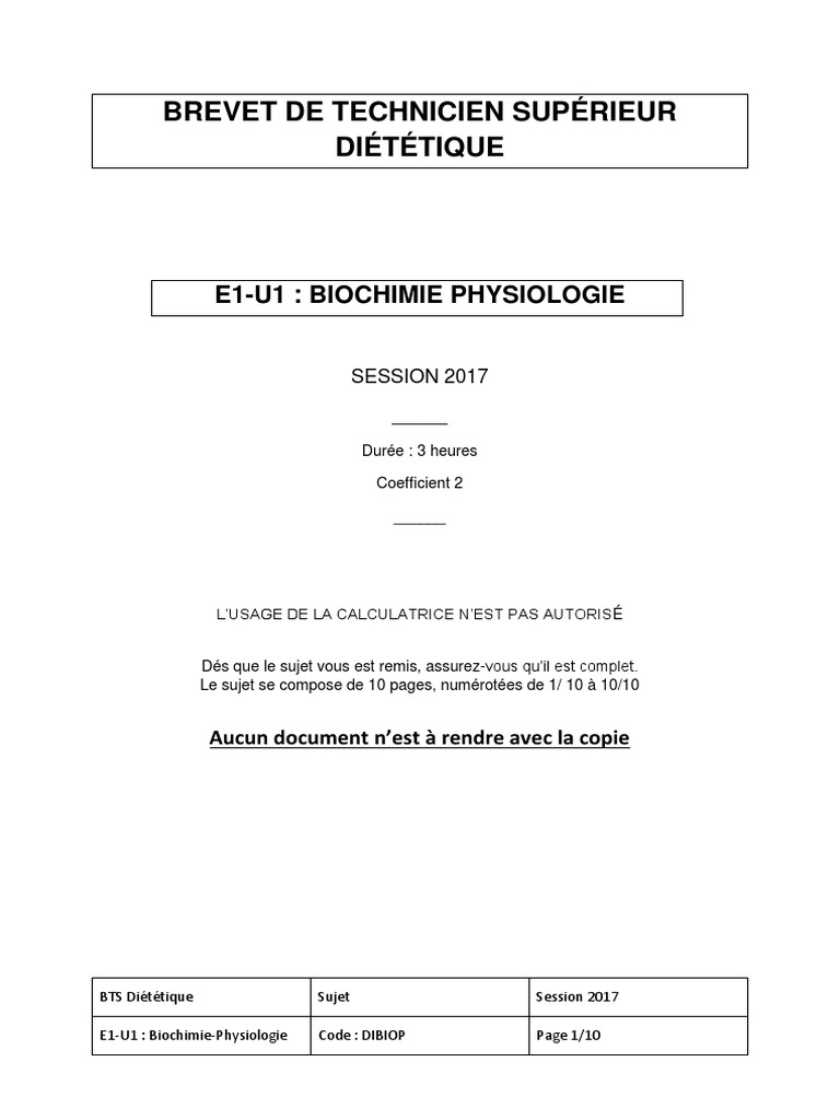 BTS Diététique E1-U1 BIOCHIMIE-PHYSIOLOGIE-Code : DIBIOP-Sujet-Page 10/10
