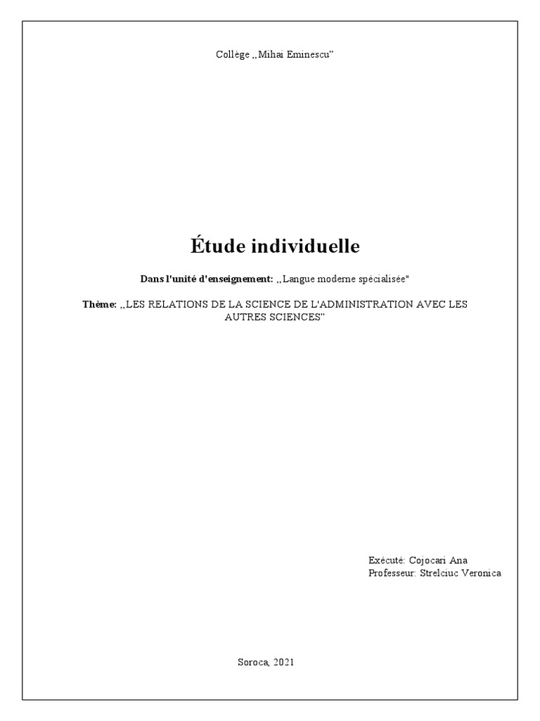 Thème: ,,LES RELATIONS DE LA SCIENCE DE L'ADMINISTRATION AVEC LES