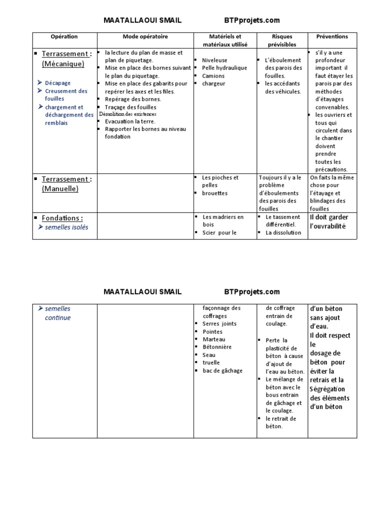 Opération Mode opératoire Matériels et Risques Préventions