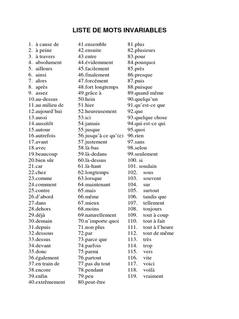 LISTE DE MOTS INVARIABLES