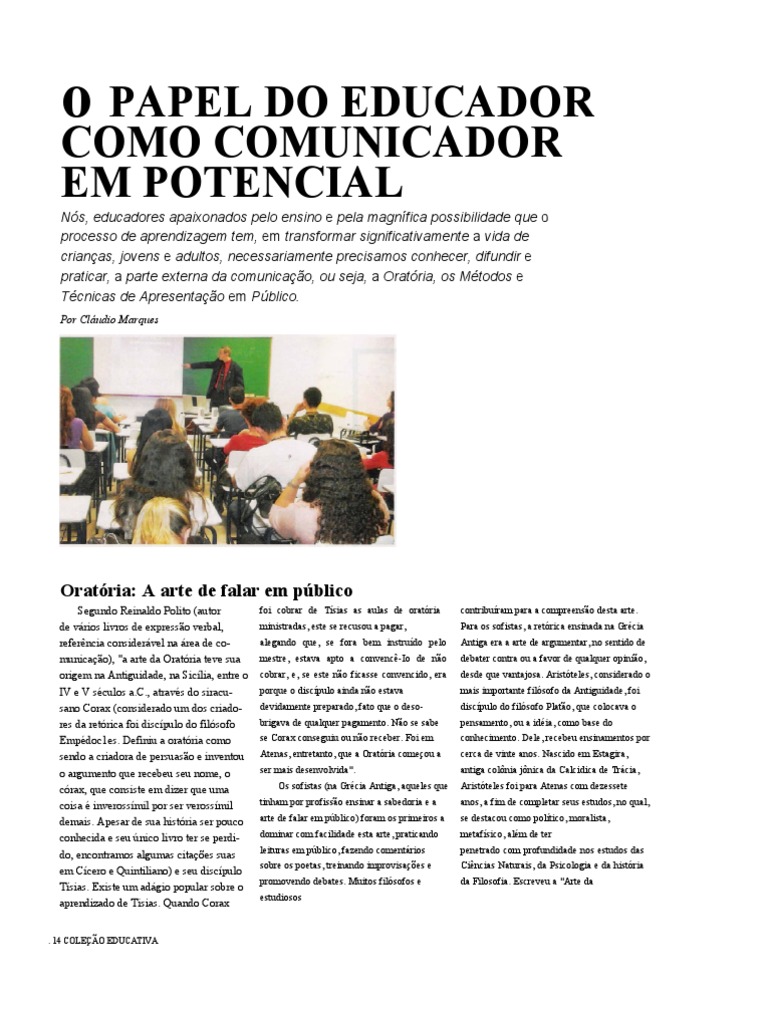 praticar, a parte externa da comunicação, ou seja, a Oratória, os Métodos e