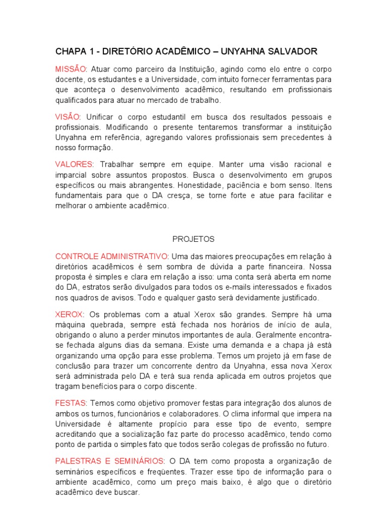 de direito da Unyahna, todos serão beneficiados, assim, pedimos o apoio e