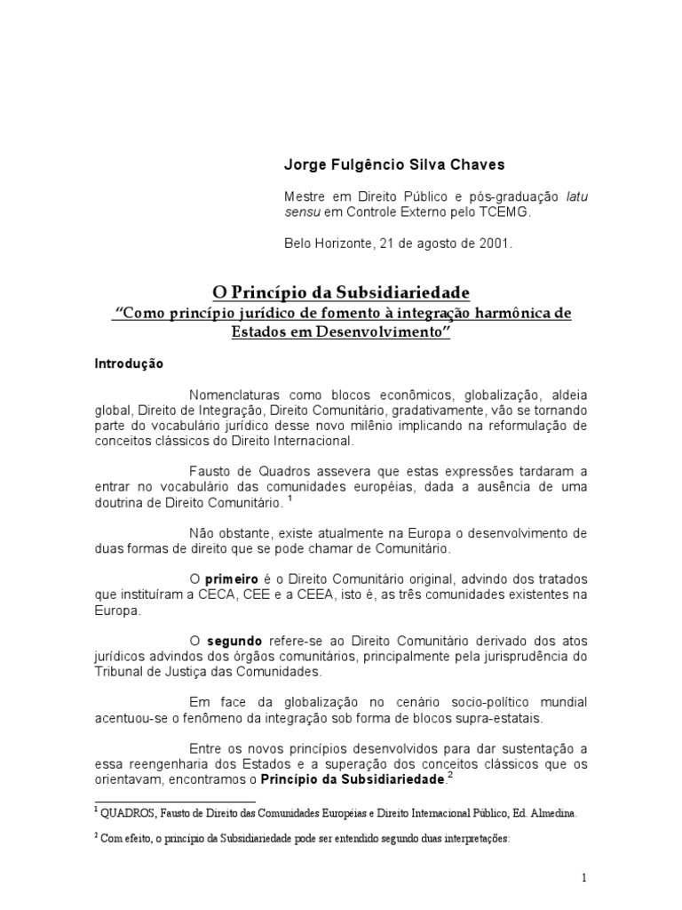 Entre os novos princípios desenvolvidos para dar sustentação a essa reengenharia dos Estados e a superação dos conceitos clássicos que os orientavam, encontramos o Princípio da Subsidiariedade. 2