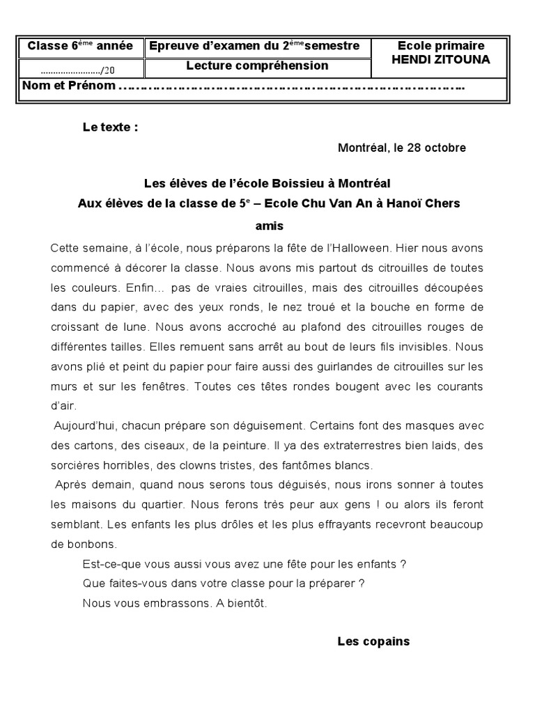 Classe 6ème année Epreuve d’examen du 2èmesemestre Ecole primaire