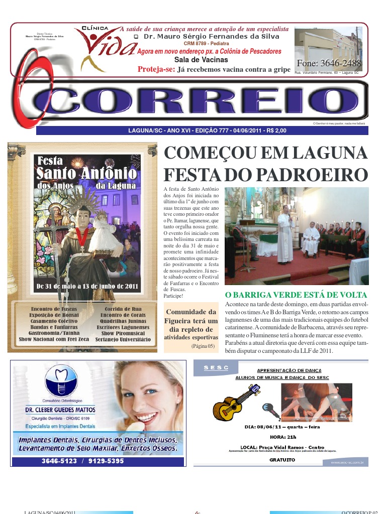 Fundado em 29.07.1995 Direo Geral: PAULO SRGIO SILVA JORNAL O CORREIO. LTDA. ME. C.G.C. 03.002.178/0001-60 Insc. Mun. 54.0375 Redao e Administrao: Rua Voluntrio Fermiano, 52 - Centro Fone: 3644-3959 - Laguna/SC Nmero Avulso: R$ 2,00 Assinatura Semestral (local) R$ 40,00 Tiragem: 2.000 exemplares Os artigos assinados so de responsabilidade de seus autores. Circulao: Laguna, Capivari de Baixo, Tubaro, Garopaba, Imbituba, Paulo Lopes, Imaru e Jaguaruna. E-mail: ocorreio@bizz.com.br hp:http://www.ocorreio.net Este jornal filiado: