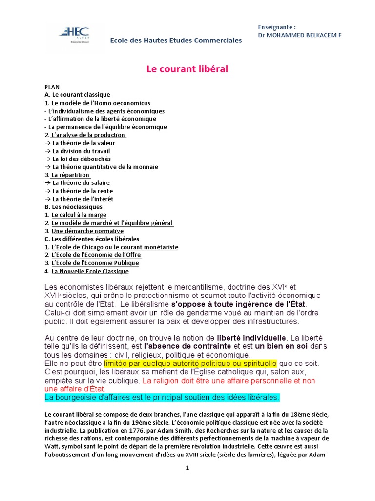 Le courant libéral se compose de deux branches, l’une classique qui apparaît à la fin du 18ème siècle,