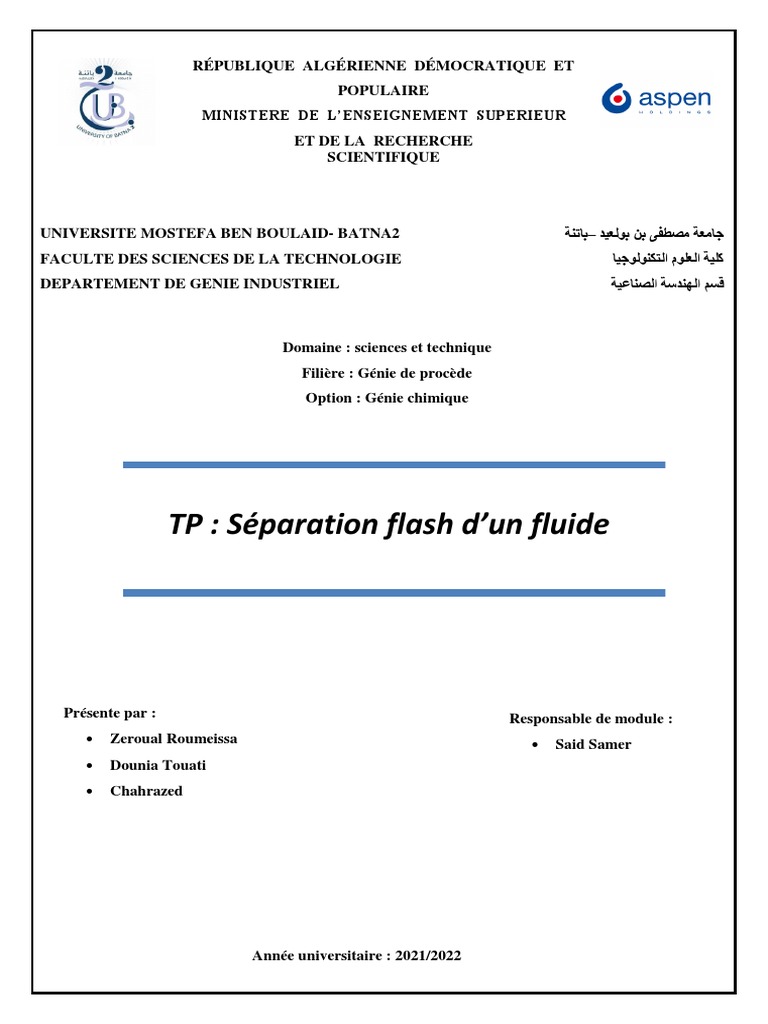 flash déterminé par sa pression et son échange de chaleur nul avec l’extérieur