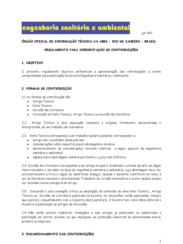 encaminhadas para publicação na Revista Engenharia Sanitária e Ambiental.