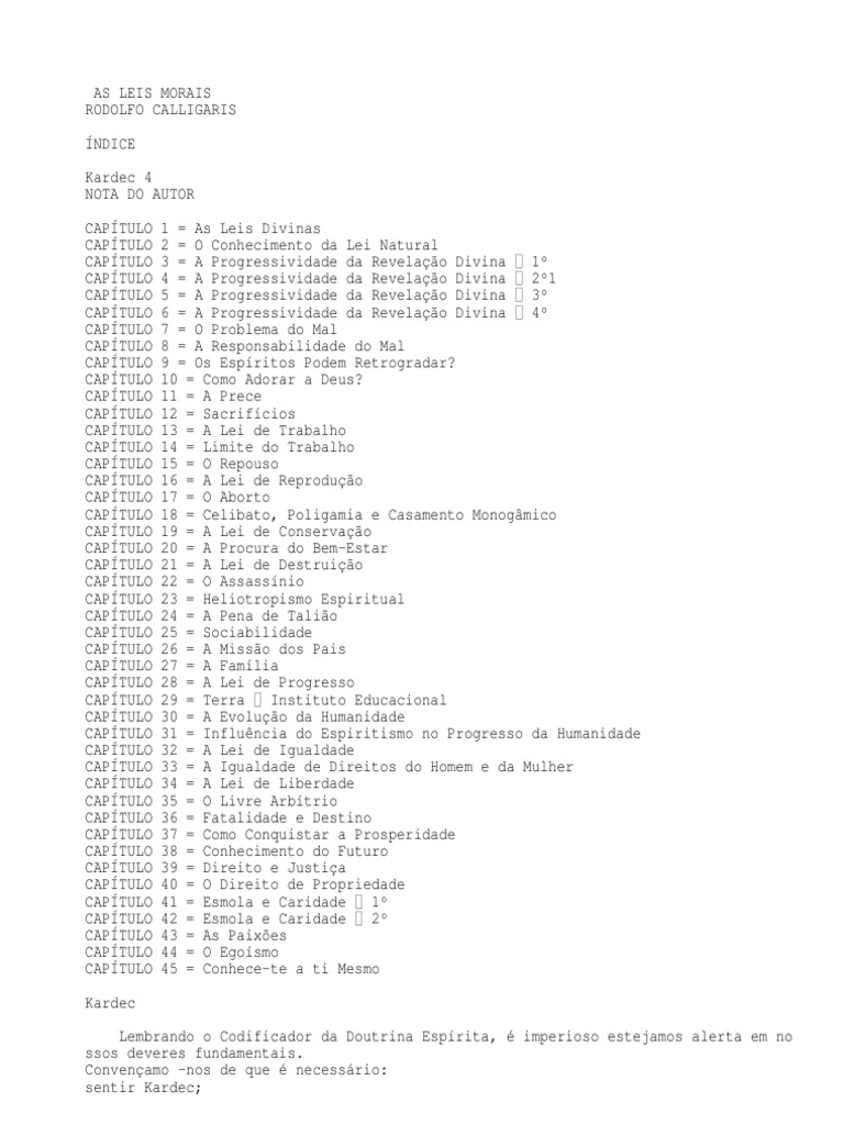 CAPTULO CAPTULO CAPTULO CAPTULO CAPTULO CAPTULO CAPTULO CAPTULO CAPTULO CAPTULO CAPTULO CAPTULO CAPTULO CAPTULO CAPTULO CAPTULO CAPTULO CAPTULO CAPTULO CAPTULO CAPTULO CAPTULO CAPTULO CAPTULO CAPTULO CAPTULO CAPTULO CAPTULO CAPTULO CAPTULO CAPTULO CAPTULO CAPTULO CAPTULO CAPTULO CAPTULO CAPTULO CAPTULO Kardec Lembrando o Codificador da Doutrina Esprita, imperioso estejamos alerta em no ssos deveres fundamentais. Convenamo -nos de que necessrio: sentir Kardec; 1 = As Leis Divinas 2 = O Conhecimento da Lei Natural 3 = A Progressividade da Revelao Divina 1 4 = A Progressividade da Revelao Divina 21 5 = A Progressividade da Revelao Divina 3 6 = A Progressividade da Revelao Divina 4 7 = O Problema do Mal 8 = A Responsabilidade do Mal 9 = Os Espritos Podem Retrogradar? 10 = Como Adorar a Deus? 11 = A Prece 12 = Sacrifcios 13 = A Lei de Trabalho 14 = Limite do Trabalho 15 = O Repouso 16 = A Lei de Reproduo 17 = O Aborto 18 = Celibato, Poligamia e Casamento Monogmico 19 = A Lei de Conservao 20 = A Procura do Bem-Estar 21 = A Lei de Destruio 22 = O Assassnio 23 = Heliotropismo Espiritual 24 = A Pena de Talio 25 = Sociabilidade 26 = A Misso dos Pais 27 = A Famlia 28 = A Lei de Progresso Instituto Educacional 29 = Terra 30 = A Evoluo da Humanidade 31 = Influncia do Espiritismo no Progresso da Humanidade 32 = A Lei de Igualdade 33 = A Igualdade de Direitos do Homem e da Mulher 34 = A Lei de Liberdade 35 = O Livre Arbtrio 36 = Fatalidade e Destino 37 = Como Conquistar a Prosperidade 38 = Conhecimento do Futuro 39 = Direito e Justia 40 = O Direito de Propriedade 41 = Esmola e Caridade 1 42 = Esmola e Caridade 2 43 = As Paixes 44 = O Egosmo 45 = Conhece-te a ti Mesmo