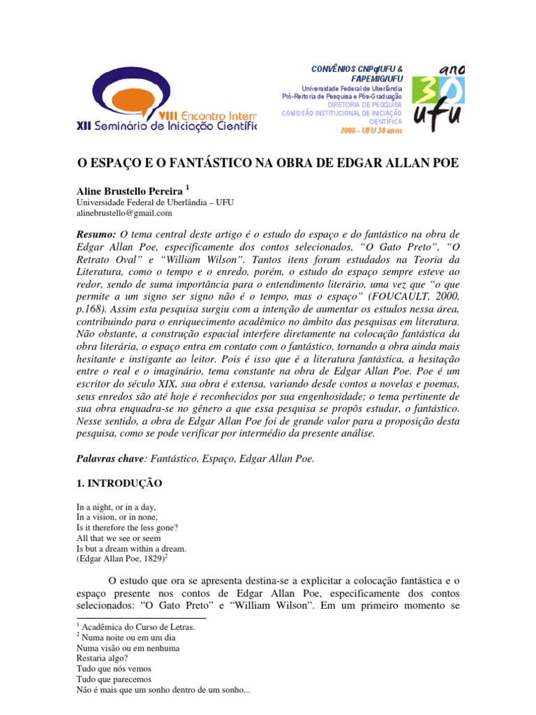 Resumo: O tema central deste artigo o estudo do espao e do fantstico na obra de Edgar Allan Poe, especificamente dos contos selecionados, O Gato Preto, O Retrato Oval e William Wilson. Tantos itens foram estudados na Teoria da Literatura, como o tempo e o enredo, porm, o estudo do espao sempre esteve ao redor, sendo de suma importncia para o entendimento literrio, uma vez que o que permite a um signo ser signo no o tempo, mas o espao (FOUCAULT, 2000, p.168). Assim esta pesquisa surgiu com a inteno de aumentar os estudos nessa rea, contribuindo para o enriquecimento acadmico no mbito das pesquisas em literatura. No obstante, a construo espacial interfere diretamente na colocao fantstica da obra literria, o espao entra em contato com o fantstico, tornando a obra ainda mais hesitante e instigante ao leitor. Pois isso que a literatura fantstica, a hesitao entre o real e o imaginrio, tema constante na obra de Edgar Allan Poe. Poe um escritor do sculo XIX, sua obra extensa, variando desde contos a novelas e poemas, seus enredos so at hoje reconhecidos por sua engenhosidade; o tema pertinente de sua obra enquadra-se no gnero a que essa pesquisa se props estudar, o fantstico. Nesse sentido, a obra de Edgar Allan Poe foi de grande valor para a proposio desta pesquisa, como se pode verificar por intermdio da presente anlise. Palavras chave: Fantstico, Espao, Edgar Allan Poe. 1. INTRODUO