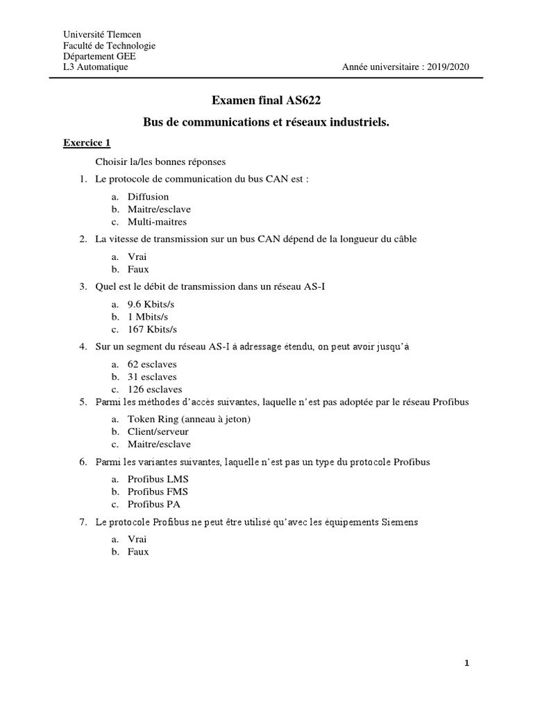 14. Le protocole Profibus ne peut être utilisé qu’avec les équipements Siemens (0.5 pt)