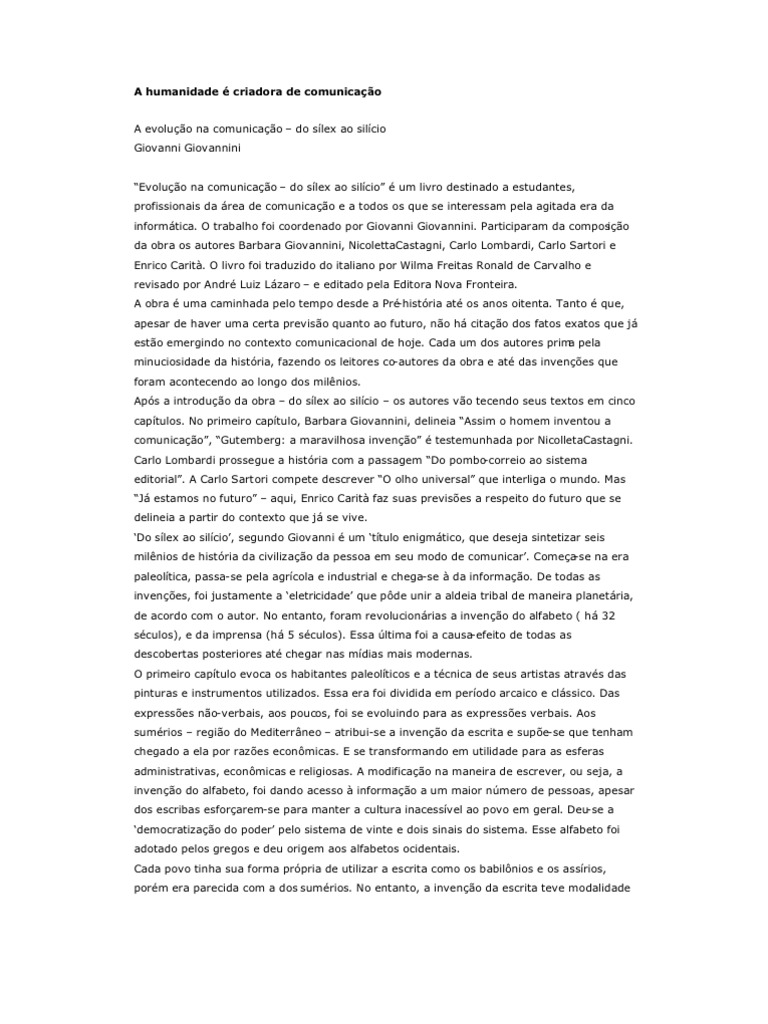 nado a estudantes, profissionais da rea de comunicao e a todos os que se interessam pela agitada era da informtica. O trabalho foi coordenado por Giovanni Giovannini. Participaram da compos io da obra os autores Barbara Giovannini, NicolettaCastagni, Carlo Lombardi, Carlo Sartori e Enrico Carit. O livro foi traduzido do italiano por Wilma Freitas Ronald de Carvalho e revisado por Andr Luiz Lzaro e editado pela Editora Nova Fronteira. A obra uma caminhada pelo tempo desde a Pr -histria at os anos oitenta. Tanto que, apesar de haver uma certa previso quanto ao futuro, no h citao dos fatos exatos que j esto emergindo no contexto comunicacional de hoje. Cada um dos autores prim pela a minuciosidade da histria, fazendo os leitores co-autores da obra e at das invenes que foram acontecendo ao longo dos milnios. Aps a introduo da obra do slex ao silcio os autores vo tecendo seus textos em cinco captulos. No primeiro captulo, Barbara Giovannini, delineia Assim o homem inventou a comunicao, Gutemberg: a maravilhosa inveno testemunhada por NicolletaCastagni. Carlo Lombardi prossegue a histria com a passagem Do pombo -correio ao sistema editorial. A Carlo Sartori compete descrever O olho universal que interliga o mundo. Mas J estamos no futuro aqui, Enrico Carit faz suas previses a respeito do futuro que se delineia a partir do contexto que j se vive. Do slex ao silcio, segundo Giovanni um ttulo enigmtico, que deseja sintetizar seis milnios de histria da civilizao da pessoa em seu modo de comunicar. Comea -se na era paleoltica, passa-se pela agrcola e industrial e chega-se da informao. De todas as invenes, foi justamente a eletricidade que pde unir a aldeia tribal de maneira planetria, de acordo com o autor. No entanto, foram revolucionrias a inveno do alfabeto ( h 32 sculos), e da imprensa (h 5 sculos). Essa ltima foi a causa-efeito de todas as descobertas posteriores at chegar nas mdias mais modernas. O primeiro captulo evoca os habitantes paleolticos e a tcnica de seus artistas atravs das pinturas e instrumentos utilizados. Essa era foi dividida em perodo arcaico e clssico. Das expresses no-verbais, aos poucos, foi se evoluindo para as expresses verbais. Aos sumrios regio do Mediterrneo atribui-se a inveno da escrita e supe-se que tenham chegado a ela por razes econmicas. E se transformando em utilidade para as esferas administrativas, econmicas e religiosas. A modificao na maneira de escrever, ou seja, a inveno do alfabeto, foi dando acesso informao a um maior nmero de pessoas, apesar dos escribas esforarem-se para manter a cultura inacessvel ao povo em geral. Deu -se a democratizao do poder pelo sistema de vinte e dois sinais do sistema. Esse alfabeto foi adotado pelos gregos e deu origem aos alfabetos ocidentais. Cada povo tinha sua forma prpria de utilizar a escrita como os babilnios e os assrios, porm era parecida com a dos sumrios. No entanto, a inveno da escrita teve modalidade