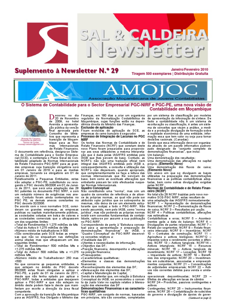 ecorreu no dia 20 de Novembro de 2009, no hotel Avenida a apresentao pblica da verso final aprovada pelo Conselho de Ministros que representa a Mussagi Aly Cassamo transio de MoamPresidente da AMOJOC Tcnico de Contas bique para as Normussagi.cassamo@gmail.com mas Internacionais de Relato Financeiro. O documento em referncia, designa-se Sistema de Contabilidade para o Sector Empresarial (SCE), e contempla o Plano Geral de Contabilidade adaptado s Normas Internacionais de Relato Financeiro PGC-NIRF para as grandes empresas cuja transio obrigatria ser em 01 Janeiro de 2010 e para as medias empresas, tornando se obrigatrio em 01 de Janeiro de 2011. Relativamente a Pequenas Entidades, estas iro adoptar o PGC-PE, substituindo ou revogando o PGC decreto 36/2006 em 01 de Janeiro de 2011, que ser uma adaptao das 28 NC patentes no documento PGC NIRF, e com um reduzido nmero de exigncias nos anexos. Contudo foram ainda contemplados no PGC PE, os demais anexos constantes no PGC decreto 32/2006. De acordo com o novo normativo SCE, consideram se grandes empresas, as empresas publicas ou capitais maioritariamente pblicos, as sociedades cotadas em bolsa de valores e as sociedades comerciais que a ultrapassem um dos seguintes limites: Total de Rendimentos 1.275 milhes de Mts Total do Activo 1.275 milhes de Mts Nmero mdio de trabalhadores 500 So consideradas pelo SCE todas as empresas que no se enquadram nas definies acima citadas mas que ultrapassam um dos seguintes limites: Total de Rendimentos> 500 milhes Mts e <1.275 milhes Mts Total do Activo> 500 milhes Mts e <1.275 milhes Mts Nmero mdio de Trabalhadores> 250 mas <500 No que concerne as pequenas entidades, e que estejam no mbito do PGC decreto 36/2006 estas ficam obrigadas a aplicar o PGC-PE, a partir de 01 de Janeiro de 2011, desde que no tenha optado por aplicar o PGC-NIRF, todas a entidades que desejarem aplicar o PGC-NIRF e que no estejam no mbito deste podem faze-lo desde que manifestam por escrito a direco da rea fiscal competente. Com a aprovao da transio de Moambique para as IAS/IFRS, fica Obrigado o Ministro das