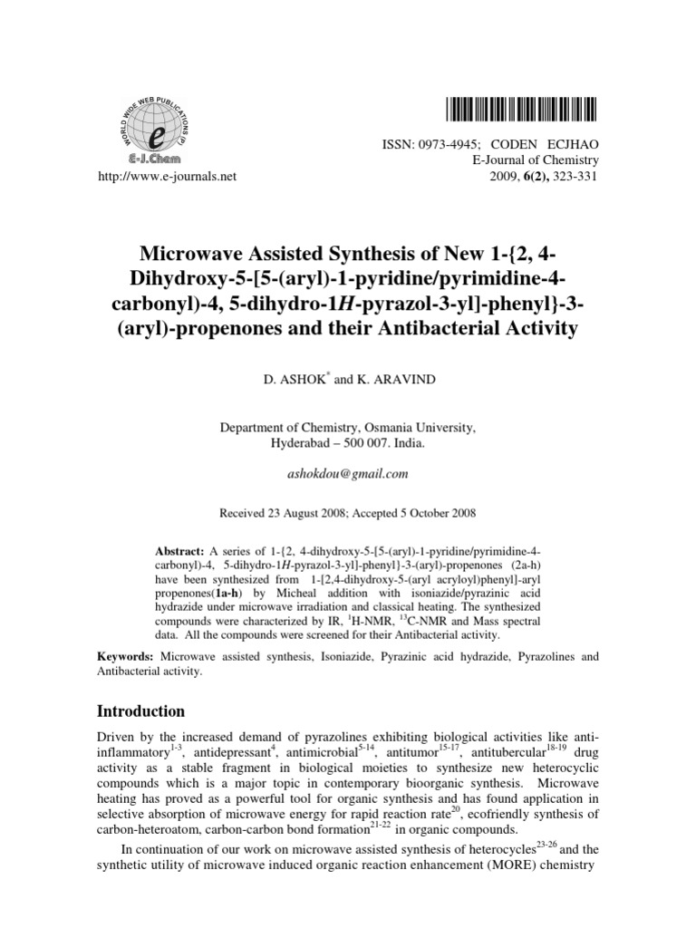 Ashok D, Pallavi K, Jagath Reddy G and Srinivas Rao K, Heterocycl Comm., 2006, 12(2), 103. Ashok D, Pallavi K, Jagath Reddy G and Srinivas Rao K, Heterocycl Comm., 2006, 12(3-4), 197. Ashok D, Pallavi K, Jagath Reddy G and Srinivas Rao K, Heterocycl Comm., 2006, 16, 71. Ashok D, Pallavi K, Jagath Reddy G and Srinivas Rao K, Heterocycl Comm., 2006, 16, 95. Cristina Ventura and Filomena Martins, J Med Chem., 2008, 51, 612624. Manjula Sritharan, Veena C, Yeruva Sivagamisundaram Sivasailappan C and Sridevi Duggirala, World J Microbiol Biotechno.l., 2006, 22, 13571364. Maria C S, Loureno Marcus, de Souza V N, Alessandra C, Pinheiro, Marcelle de L, Ferreira, Raoni S B, Gonalves, Thais Cristina M, Nogueira and Mnica A, Peraltab, Arkivoc., 2007, (xv), 181-191. Rollas S, Kalyoncuoglu N, Sur-Altiner D and Yegenolglu Y, Pharmazie., 1993, 48, 308