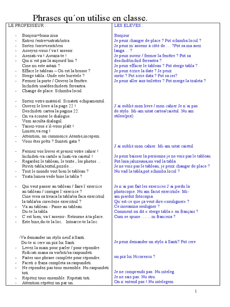 - Qui veut passer au tableau / faire l´exercice Je n´ai pas fait les exercices J´ai perdu la