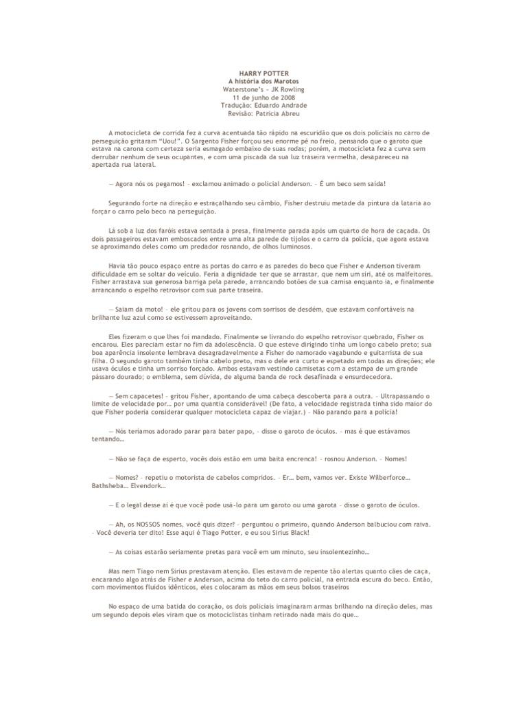 A motocicleta de corrida fez a curva acentuada to rpido na escurido que os dois policiais no carro de perseguio gritaram Uou!. O Sargento Fisher forou seu enorme p no freio, pensando que o garoto que estava na carona com certeza seria esmagado embaixo de suas rodas; porm, a motocicleta fez a curva sem derrubar nenhum de seus ocupantes, e com uma piscada da sua luz traseira vermelha, desapareceu na apertada rua lateral. Agora ns os pegamos! exclamou animado o policial Anderson. um beco sem sada! Segurando forte na direo e estraalhando seu cmbio, Fisher destruiu metade da pintura da lataria ao forar o carro pelo beco na perseguio. L sob a luz dos faris estava sentada a presa, finalmente parada aps um quarto de hora de caada. Os dois passageiros estavam emboscados entre uma alta parede de tijolos e o carro da polcia, que agora estava se aproximando deles como um predador rosnando, de olhos luminosos. Havia to pouco espao entre as portas do carro e as paredes do beco que Fisher e Anderson tiveram dificuldade em se soltar do veculo. Feria a dignidade ter que se arrastar, que nem um siri, at os malfeitores. Fisher arrastava sua generosa barriga pela parede, arrancando botes de sua camisa enquanto ia, e finalmente arrancando o espelho retrovisor com sua parte traseira. Saiam da moto! ele gritou para os jovens com sorrisos de desdm, que estavam confortveis na brilhante luz azul como se estivessem aproveitando. Eles fizeram o que lhes foi mandado. Finalmente se livrando do espelho retrovisor quebrado, Fisher os encarou. Eles pareciam estar no fim da adolescncia. O que esteve dirigindo tinha um longo cabelo preto; sua boa aparncia insolente lembrava desagradavelmente a Fisher do namorado vagabundo e guitarrista de sua filha. O segundo garoto tambm tinha cabelo preto, mas o dele era curto e espetado em todas as direes; ele usava culos e tinha um sorriso forado. Ambos estavam vestindo camisetas com a estampa de um grande pssaro dourado; o emblema, sem dvida, de alguma banda de rock desafinada e ensurdecedora. Sem capacetes! gritou Fisher, apontando de uma cabea descoberta para a outra. Ultrapassando o limite de velocidade por por uma quantia considervel! (De fato, a velocidade registrada tinha sido maior do que Fisher poderia considerar qualquer motocicleta capaz de viajar.) No parando para a polcia! Ns teramos adorado parar para bater papo, disse o garoto de culos. mas que estvamos tentando No se faa de esperto, vocs dois esto em uma baita encrenca! rosnou Anderson. Nomes! Nomes? repetiu o motorista de cabelos compridos. Er bem, vamos ver. Existe Wilberforce Bathsheba Elvendork E o legal desse a que voc pode us-lo para um garoto ou uma garota disse o garoto de culos. Ah, os NOSSOS nomes, voc quis dizer? perguntou o primeiro, quando Anderson balbuciou com raiva. Voc deveria ter dito! Esse aqui Tiago Potter, e eu sou Sirius Black! As coisas estaro seriamente pretas para voc em um minuto, seu insolentezinho Mas nem Tiago nem Sirius prestavam ateno. Eles estavam de repente to alertas quanto ces de caa, encarando algo atrs de Fisher e Anderson, acima do teto do carro policial, na entrada escura do beco. Ento, com movimentos fluidos idnticos, eles c olocaram as mos em seus bolsos traseiros No espao de uma batida do corao, os dois policiais imaginaram armas brilhando na direo deles, mas um segundo depois eles viram que os motociclistas tinham retirado nada mais do que