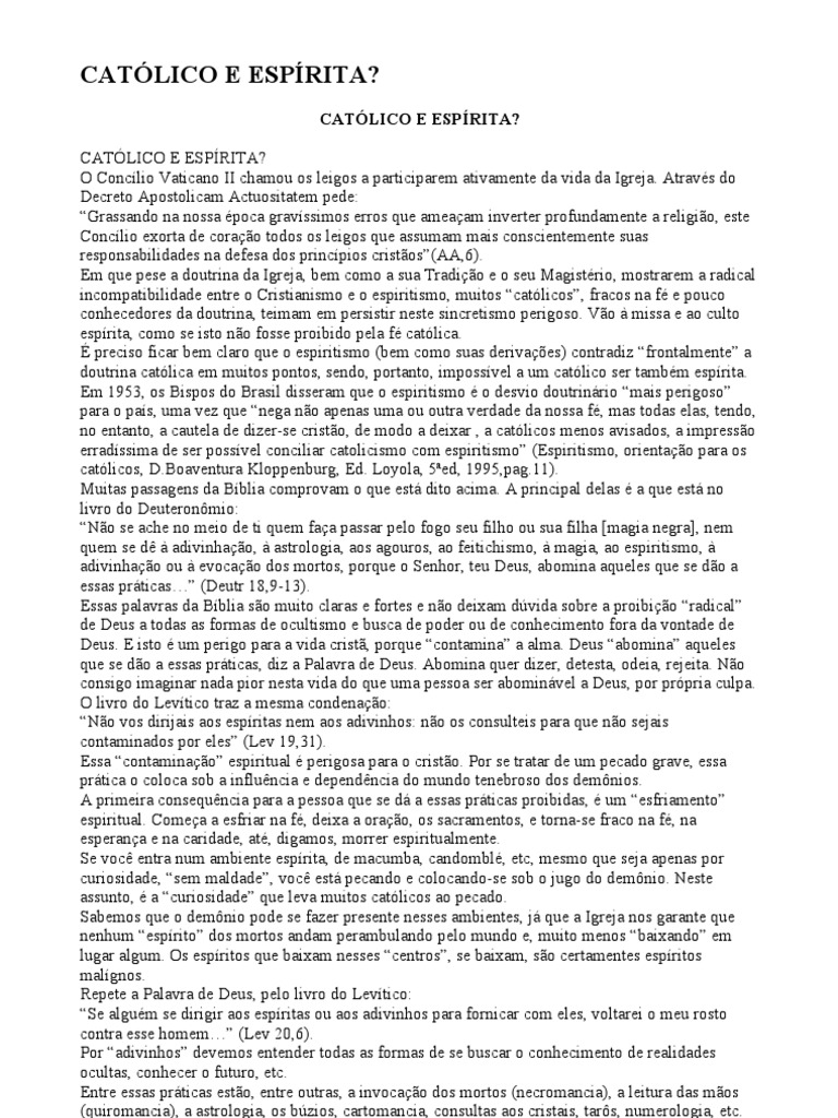 CATLICO E ESPRITA? CATLICO E ESPRITA? O Conclio Vaticano II chamou os leigos a participarem ativamente da vida da Igreja. Atravs do Decreto Apostolicam Actuositatem pede: Grassando na nossa poca gravssimos erros que ameaam inverter profundamente a religio, este Conclio exorta de corao todos os leigos que assumam mais conscientemente suas responsabilidades na defesa dos princpios cristos(AA,6). Em que pese a doutrina da Igreja, bem como a sua Tradio e o seu Magistrio, mostrarem a radical incompatibilidade entre o Cristianismo e o espiritismo, muitos catlicos, fracos na f e pouco conhecedores da doutrina, teimam em persistir neste sincretismo perigoso. Vo missa e ao culto esprita, como se isto no fosse proibido pela f catlica. preciso ficar bem claro que o espiritismo (bem como suas derivaes) contradiz frontalmente a doutrina catlica em muitos pontos, sendo, portanto, impossvel a um catlico ser tambm esprita. Em 1953, os Bispos do Brasil disseram que o espiritismo o desvio doutrinrio mais perigoso para o pas, uma vez que nega no apenas uma ou outra verdade da nossa f, mas todas elas, tendo, no entanto, a cautela de dizer-se cristo, de modo a deixar , a catlicos menos avisados, a impresso erradssima de ser possvel conciliar catolicismo com espiritismo (Espiritismo, orientao para os catlicos, D.Boaventura Kloppenburg, Ed. Loyola, 5ed, 1995,pag.11). Muitas passagens da Bblia comprovam o que est dito acima. A principal delas a que est no livro do Deuteronmio: No se ache no meio de ti quem faa passar pelo fogo seu filho ou sua filha [magia negra], nem quem se d adivinhao, astrologia, aos agouros, ao feitichismo, magia, ao espiritismo, adivinhao ou evocao dos mortos, porque o Senhor, teu Deus, abomina aqueles que se do a essas prticas (Deutr 18,9-13). Essas palavras da Bblia so muito claras e fortes e no deixam dvida sobre a proibio radical de Deus a todas as formas de ocultismo e busca de poder ou de conhecimento fora da vontade de Deus. E isto um perigo para a vida crist, porque contamina a alma. Deus abomina aqueles que se do a essas prticas, diz a Palavra de Deus. Abomina quer dizer, detesta, odeia, rejeita. No consigo imaginar nada pior nesta vida do que uma pessoa ser abominvel a Deus, por prpria culpa. O livro do Levtico traz a mesma condenao: No vos dirijais aos espritas nem aos adivinhos: no os consulteis para que no sejais contaminados por eles (Lev 19,31). Essa contaminao espiritual perigosa para o cristo. Por se tratar de um pecado grave, essa prtica o coloca sob a influncia e dependncia do mundo tenebroso dos demnios. A primeira consequncia para a pessoa que se d a essas prticas proibidas, um esfriamento espiritual. Comea a esfriar na f, deixa a orao, os sacramentos, e torna-se fraco na f, na esperana e na caridade, at, digamos, morrer espiritualmente. Se voc entra num ambiente esprita, de macumba, candombl, etc, mesmo que seja apenas por curiosidade, sem maldade, voc est pecando e colocando-se sob o jugo do demnio. Neste assunto, a curiosidade que leva muitos catlicos ao pecado. Sabemos que o demnio pode se fazer presente nesses ambientes, j que a Igreja nos garante que nenhum esprito dos mortos andam perambulando pelo mundo e, muito menos baixando em lugar algum. Os espritos que baixam nesses centros, se baixam, so certamentes espritos malgnos. Repete a Palavra de Deus, pelo livro do Levtico: Se algum se dirigir aos espritas ou aos adivinhos para fornicar com eles, voltarei o meu rosto contra esse homem (Lev 20,6). Por adivinhos devemos entender todas as formas de se buscar o conhecimento de realidades ocultas, conhecer o futuro, etc. Entre essas prticas esto, entre outras, a invocao dos mortos (necromancia), a leitura das mos (quiromancia), a astrologia, os bzios, cartomancia, consultas aos cristais, tars, numerologia, etc.