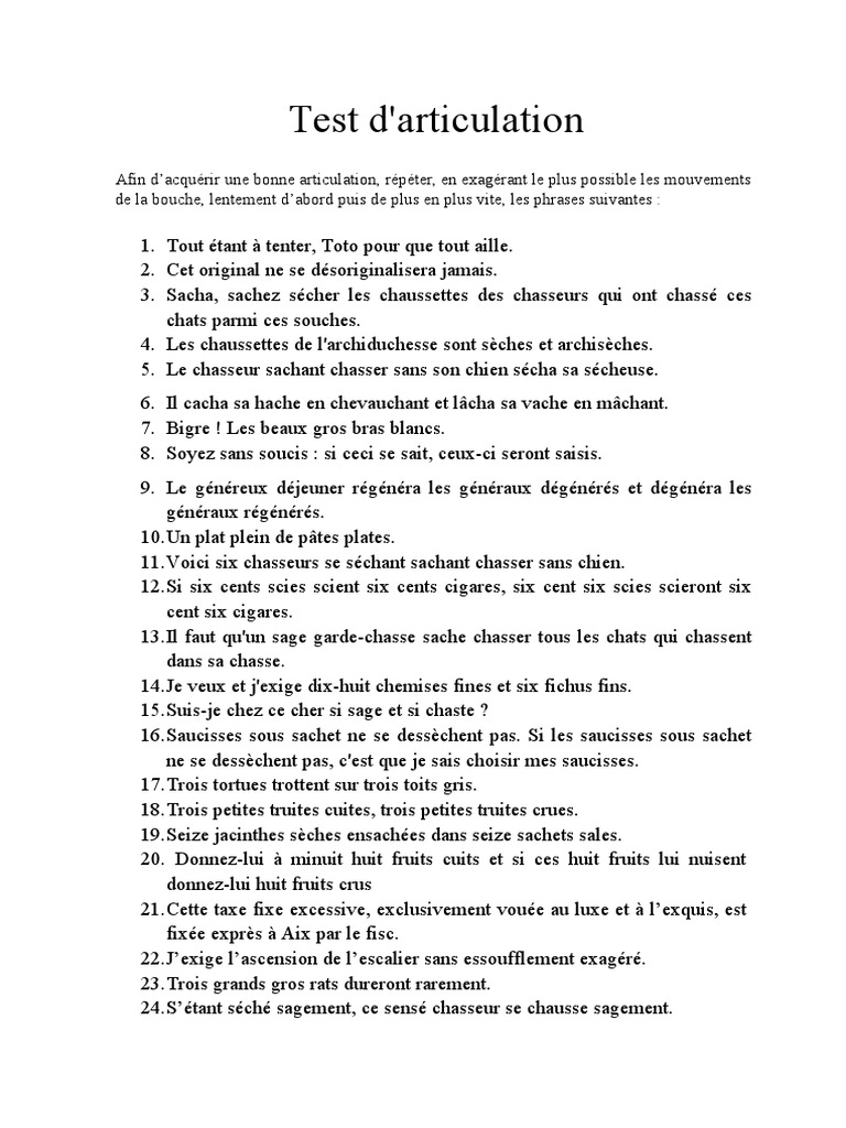 de la bouche, lentement d’abord puis de plus en plus vite, les phrases suivantes :