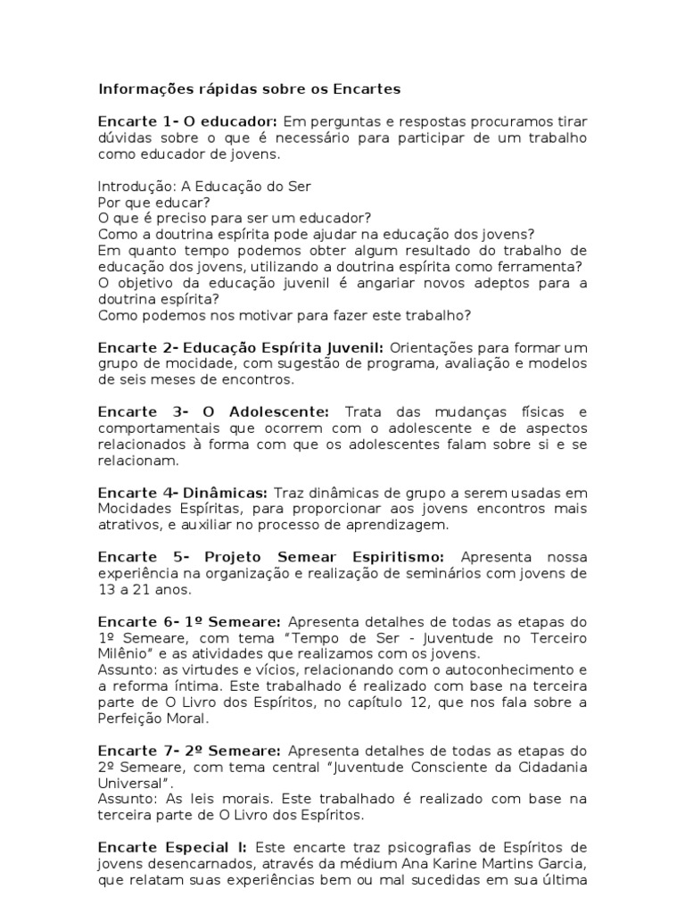 encarnao para levar a mensagem da imortalidade da alma aos jovens ainda em experincia na matria. A partir da faixa de dezesseis anos j possvel o uso de atividades assim, que mostram fatos reais e concretos. Encarte Especial II: Este encarte traz textos variados como contos, pensamentos e estrias escritos por jovens desencarnados, atravs da psicografia da mdium Tatiane Martins Garcia, e tem como objetivo promover a reflexo sobre a Doutrina Esprita, com base na codificao esprita. Acompanhando cada texto h uma atividade ldica, explorando os temas de cada produo, que poder ser usada em encontros de educao esprita com jovens de treze e quatorze anos. Encarte Especial III: Este encarte traz textos escritos por jovens desencarnados, atravs da psicografia da mdium Tatiane Martins Garcia, e tem como objetivo promover a reflexo sobre os Temas do 1 Semeare: Tempo de Ser - Juventude no Terceiro Milnio, os vcios e as virtudes, com base na codificao esprita. Seguindo o mesmo estilo do encarte anterior, para cada texto foi elaborada uma atividade ldica, que poder ser usada em encontros de educao esprita com jovens de quinze a vinte e um anos.