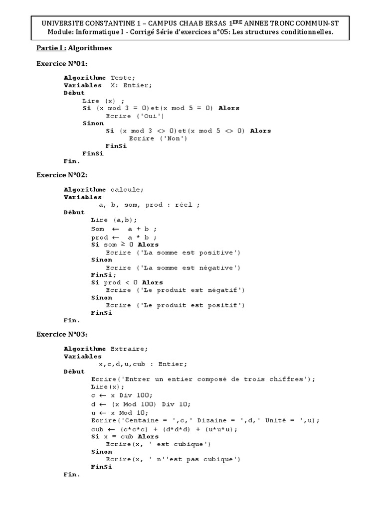 Module: Informatique I - Corrigé Série d’exercices n°05: Les structures conditionnelles.