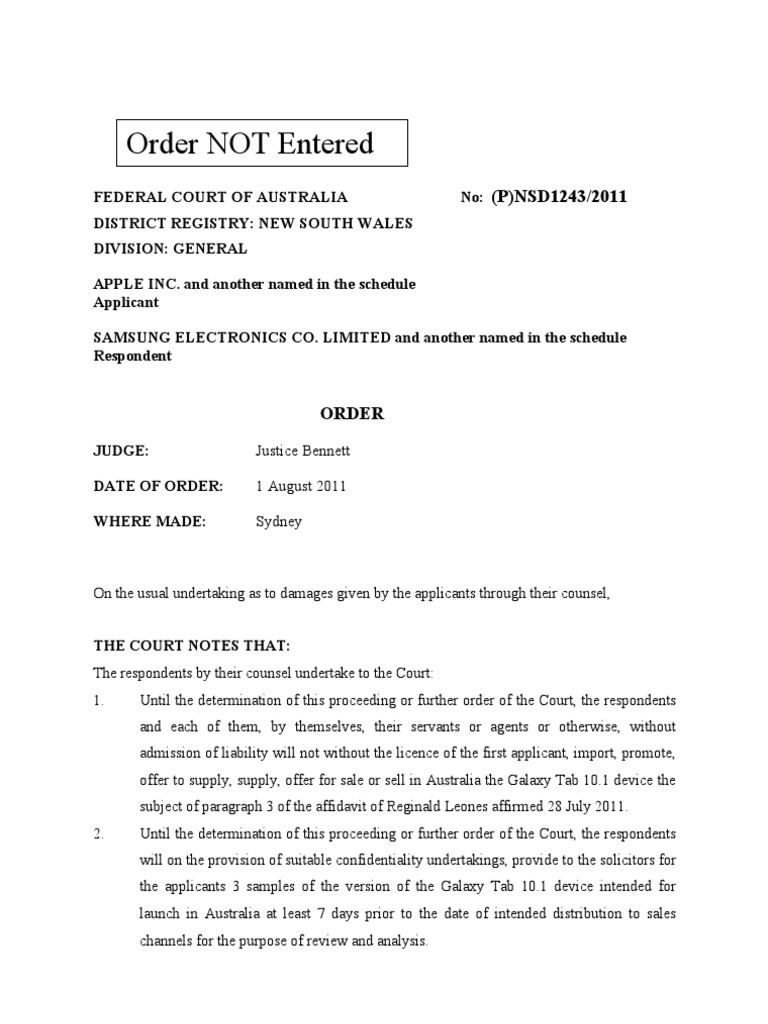 On the usual undertaking as to damages given by the applicants through their counsel, THE COURT NOTES THAT: The respondents by their counsel undertake to the Court: 1. Until the determination of this proceeding or further order of the Court, the respondents and each of them, by themselves, their servants or agents or otherwise, without admission of liability will not without the licence of the first applicant, import, promote, offer to supply, supply, offer for sale or sell in Australia the Galaxy Tab 10.1 device the subject of paragraph 3 of the affidavit of Reginald Leones affirmed 28 July 2011. 2. Until the determination of this proceeding or further order of the Court, the respondents will on the provision of suitable confidentiality undertakings, provide to the solicitors for the applicants 3 samples of the version of the Galaxy Tab 10.1 device intended for launch in Australia at least 7 days prior to the date of intended distribution to sales channels for the purpose of review and analysis.