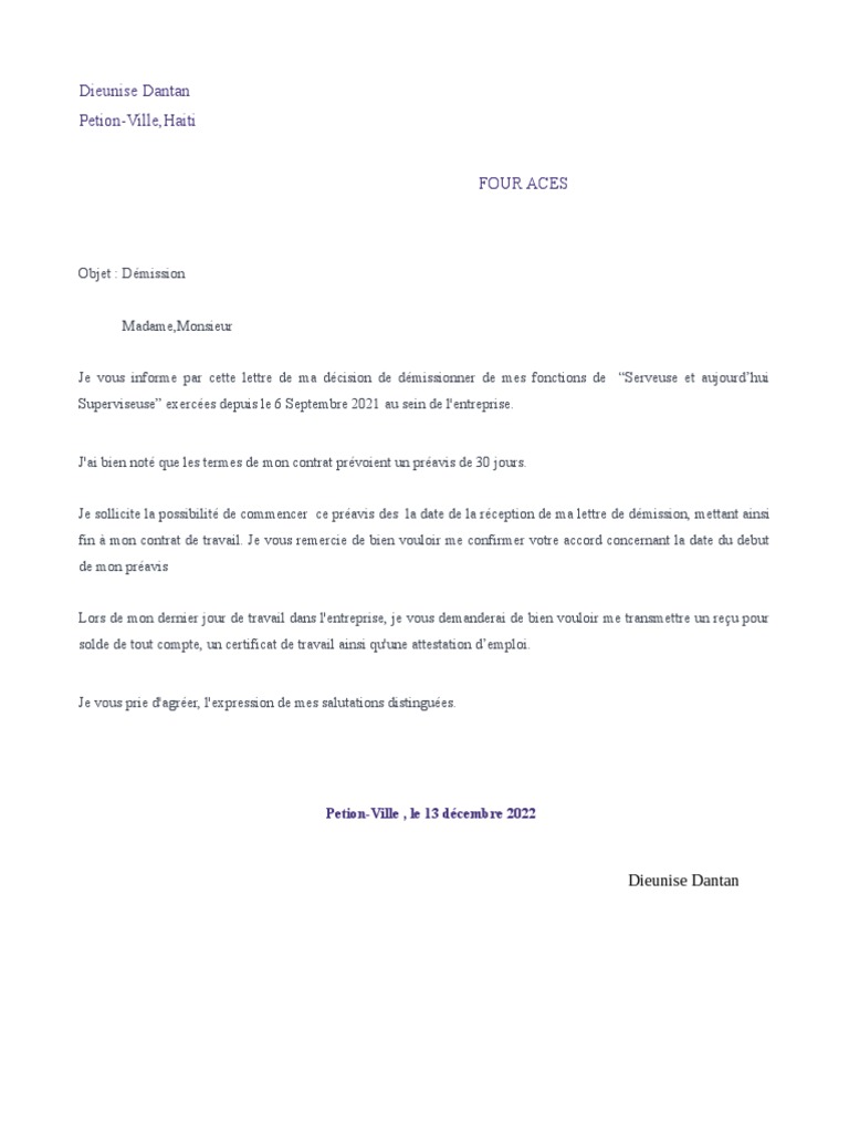 Je sollicite la possibilité de commencer ce préavis des la date de la réception de ma lettre de démission, mettant ainsi