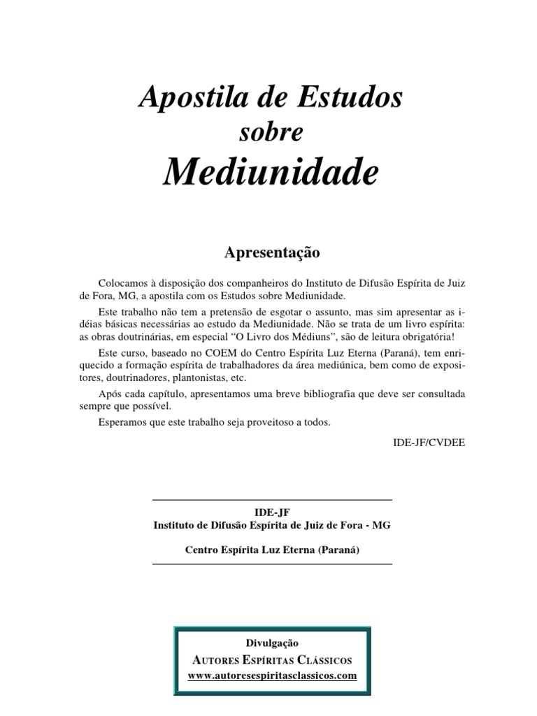 Colocamos à disposição dos companheiros do Instituto de Difusão Espírita de Juiz de Fora, MG, a apostila com os Estudos sobre Mediunidade. Este trabalho não tem a pretensão de esgotar o assunto, mas sim apresentar as i- déias básicas necessárias ao estudo da Mediunidade. Não se trata de um livro espírita: