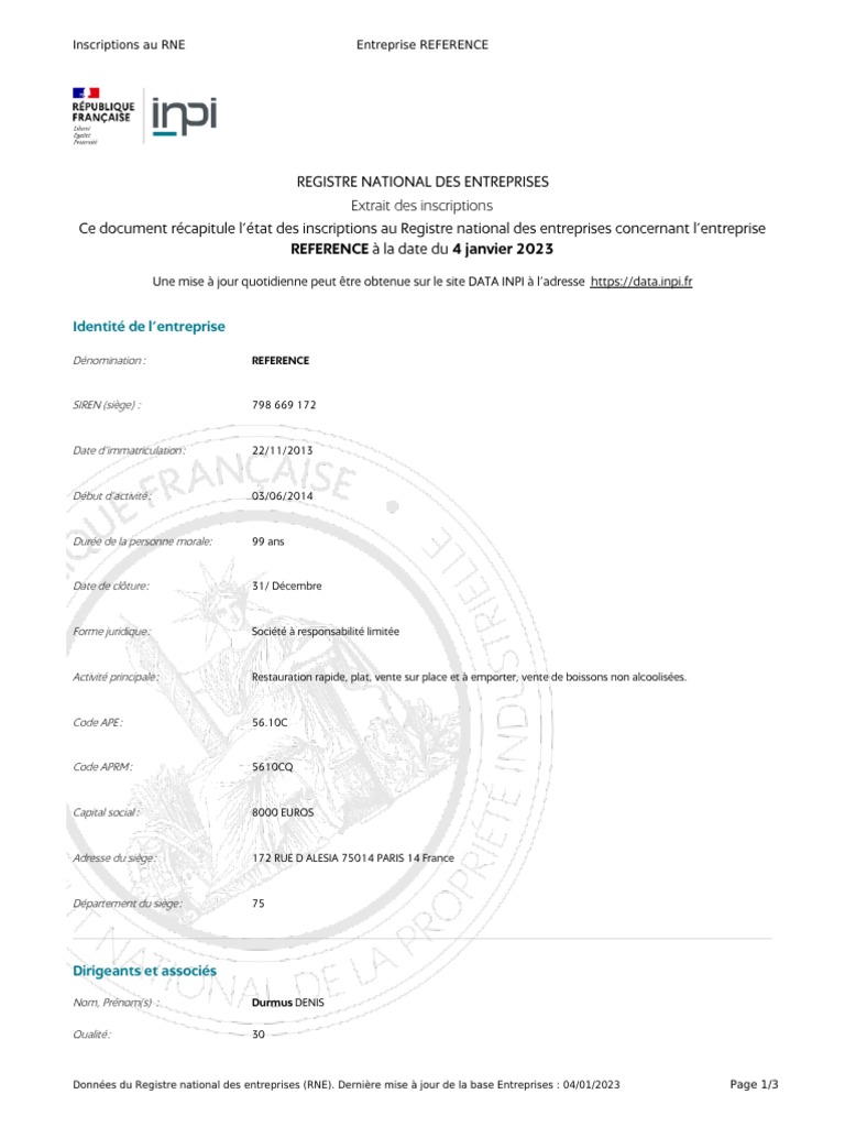 Ce document récapitule l’état des inscriptions au Registre national des entreprises concernant l’entreprise