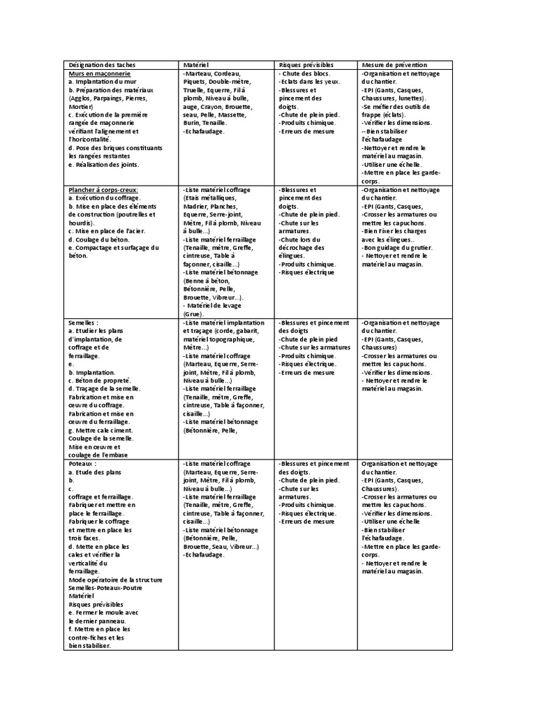coffrage et ferraillage. coffrage et ferraillage. -Chute de plein pied. -EPI (Gants, Casques,
