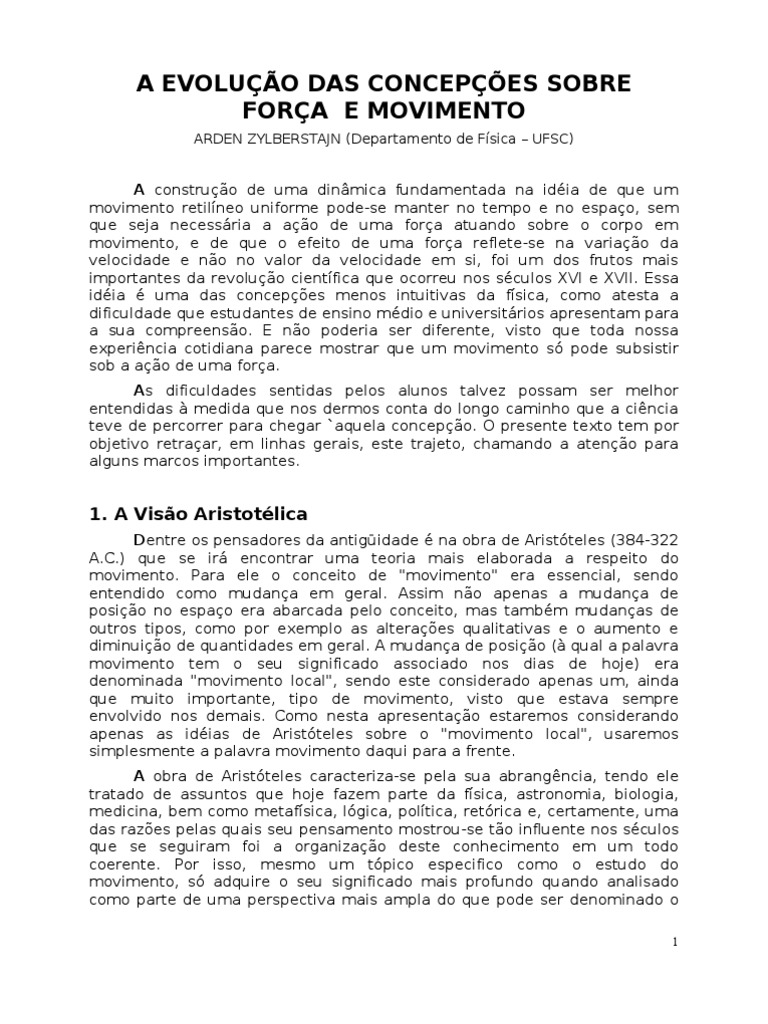 A construo de uma dinmica fundamentada na idia de que um movimento retilneo uniforme pode-se manter no tempo e no espao, sem que seja necessria a ao de uma fora atuando sobre o corpo em movimento, e de que o efeito de uma fora reflete-se na variao da velocidade e no no valor da velocidade em si, foi um dos frutos mais importantes da revoluo cientfica que ocorreu nos sculos XVI e XVII. Essa idia uma das concepes menos intuitivas da fsica, como atesta a dificuldade que estudantes de ensino mdio e universitrios apresentam para a sua compreenso. E no poderia ser diferente, visto que toda nossa experincia cotidiana parece mostrar que um movimento s pode subsistir sob a ao de uma fora. As dificuldades sentidas pelos alunos talvez possam ser melhor entendidas medida que nos dermos conta do longo caminho que a cincia teve de percorrer para chegar `aquela concepo. O presente texto tem por objetivo retraar, em linhas gerais, este trajeto, chamando a ateno para alguns marcos importantes.